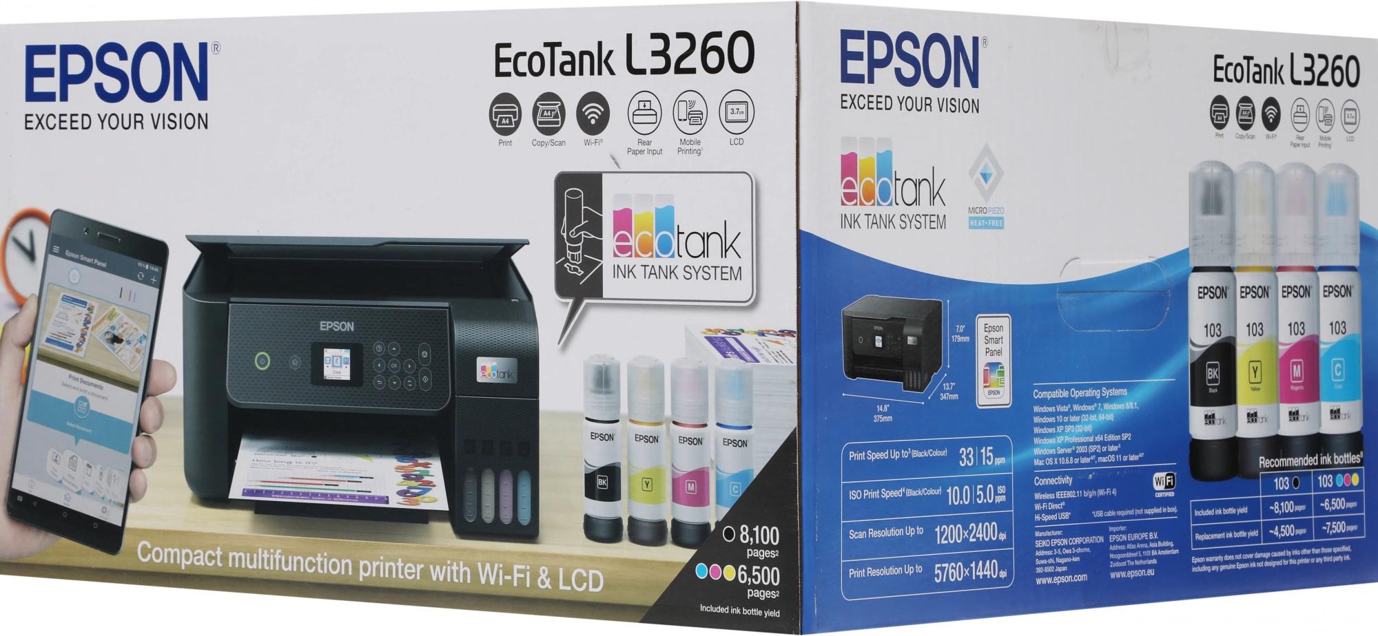 Принтер-сканер-копир, руководство по установке, гарантийный талон, контейнеры с чернилами (черный - 8100стр., голубой, пурпурный, желтый - 6500 стр.)
