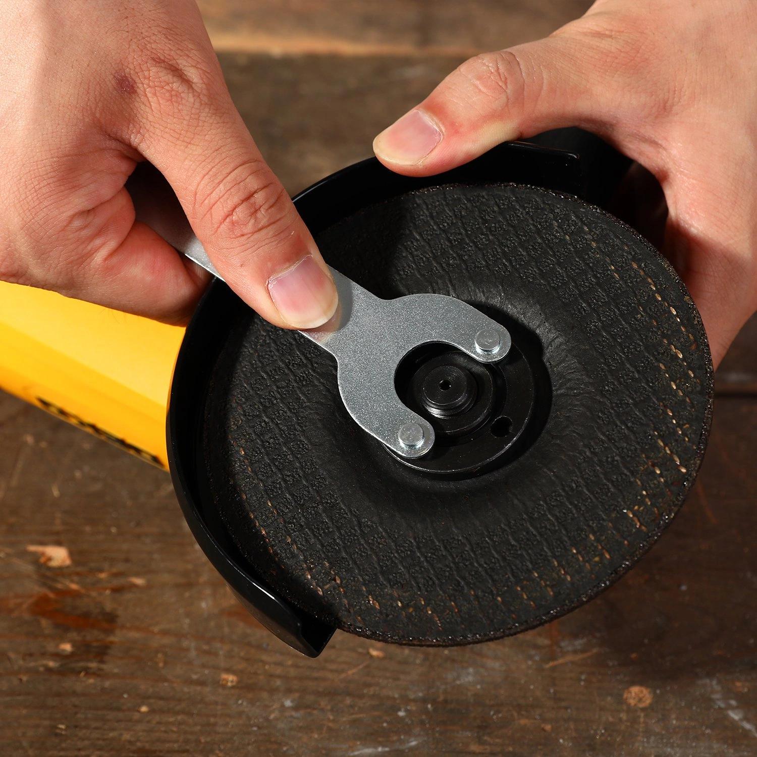 Предусмотрена функция регулировки скорости оборотов. Диск закрыт специальным кожухом для защиты оператора от травм. Наличие дополнительной трехпозиционной рукоятки обеспечивает лучший контроль и безопасность во время работы. Кнопка блокировки шпинделя.
