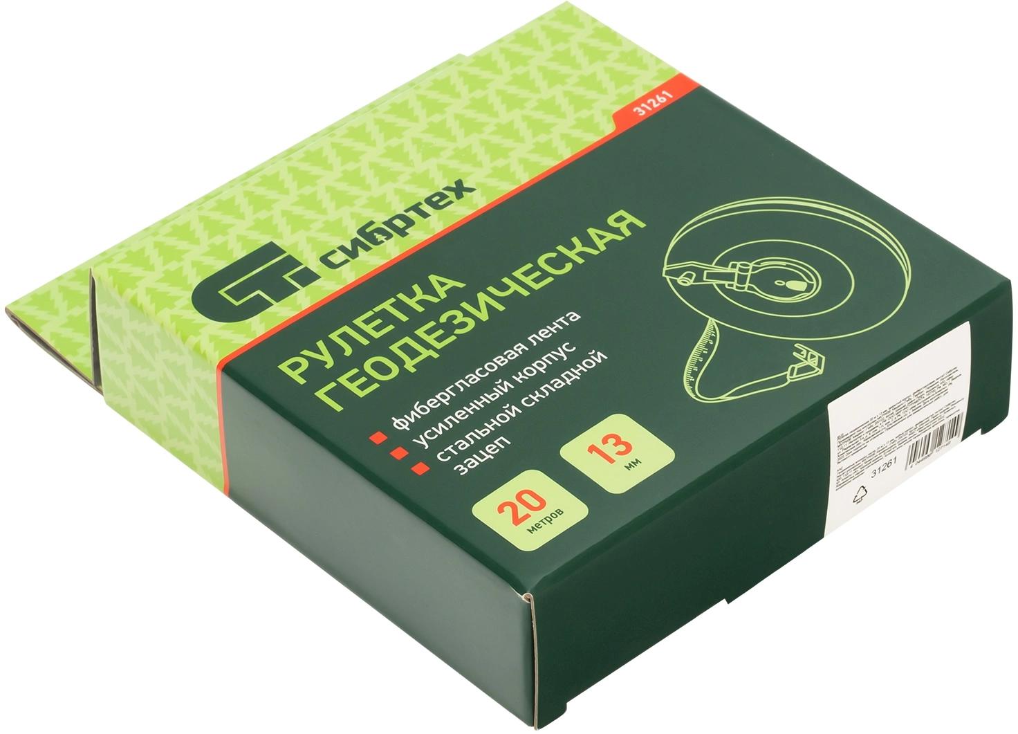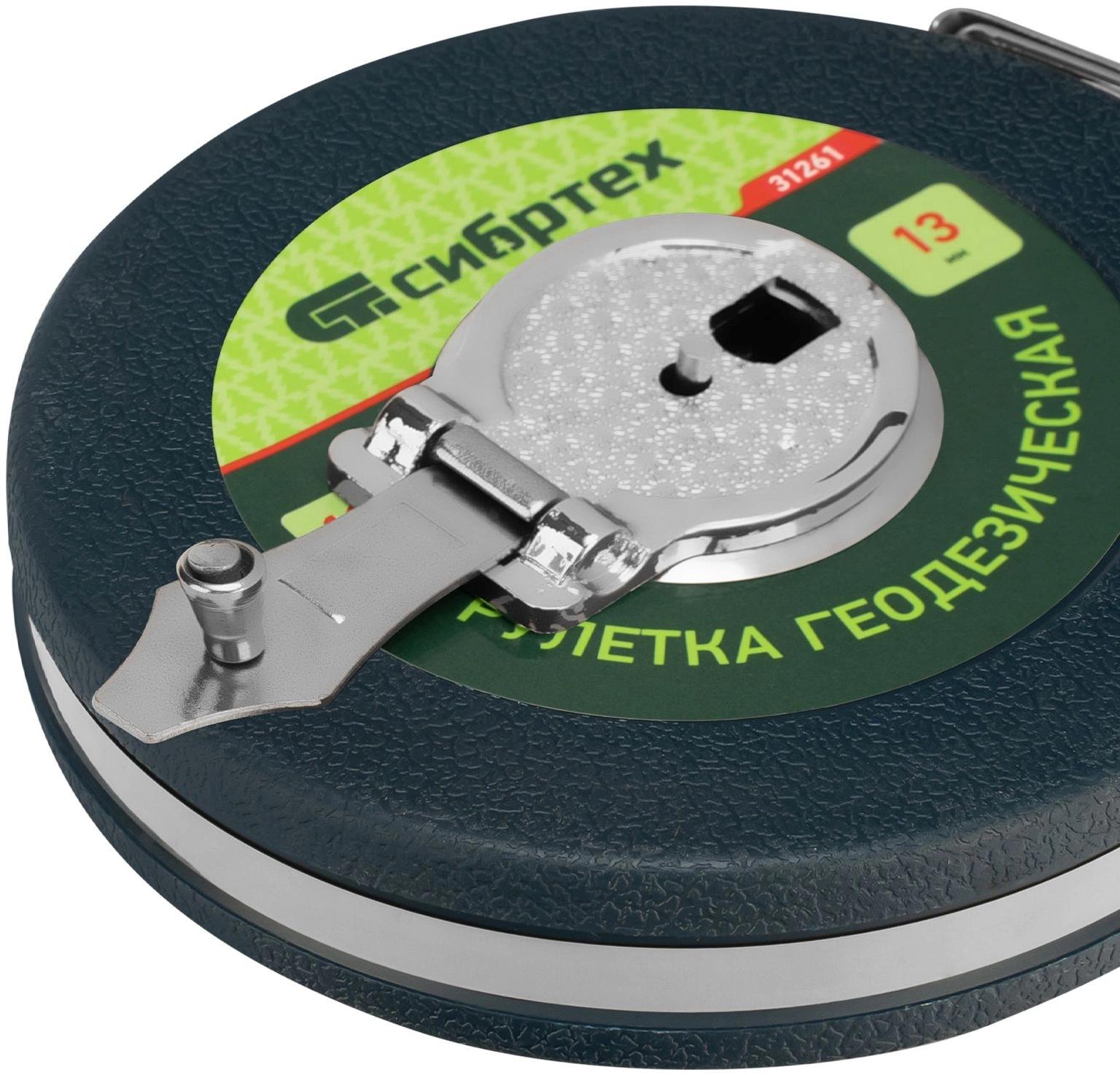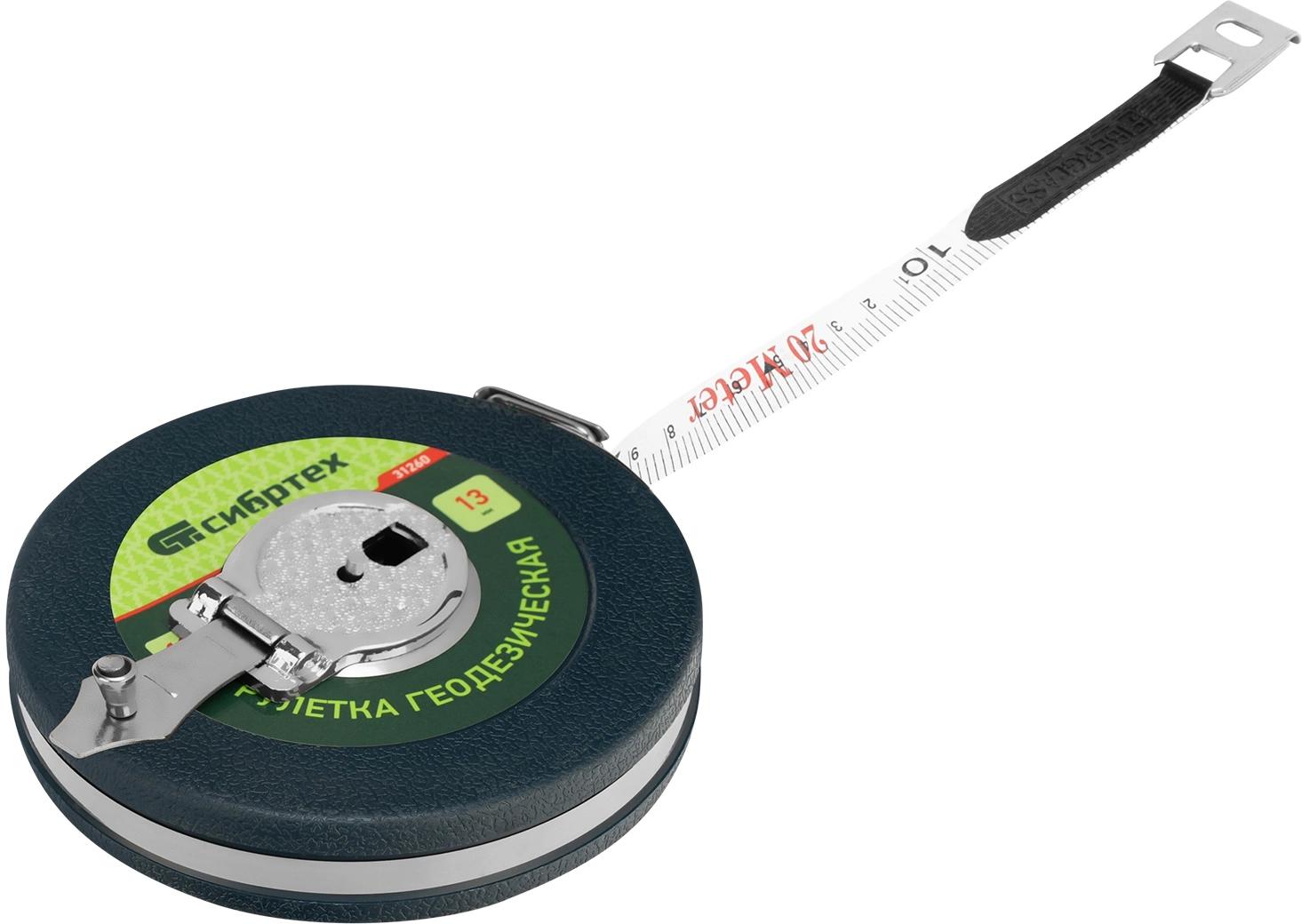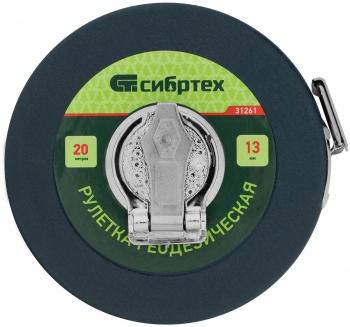 Геодезическая рулетка Сибртех 31261, 20 м. х 13 мм., в закрытом корпусе, с фибергласовой лентой, — измерительный инструмент для определения расстояний и проведения замеров различных объектов.