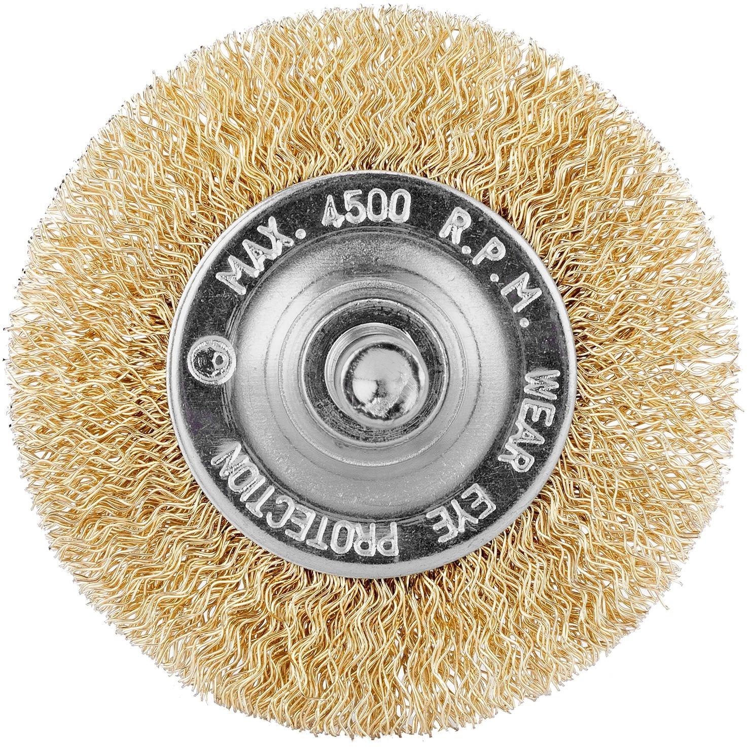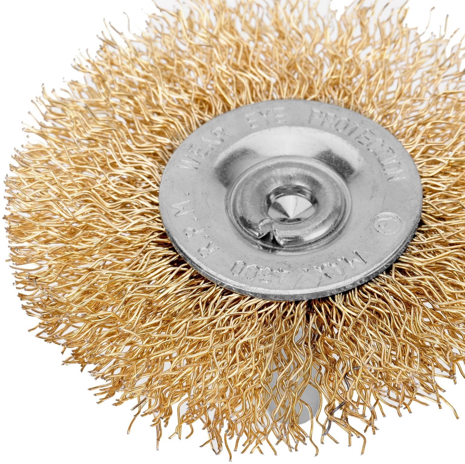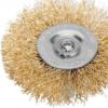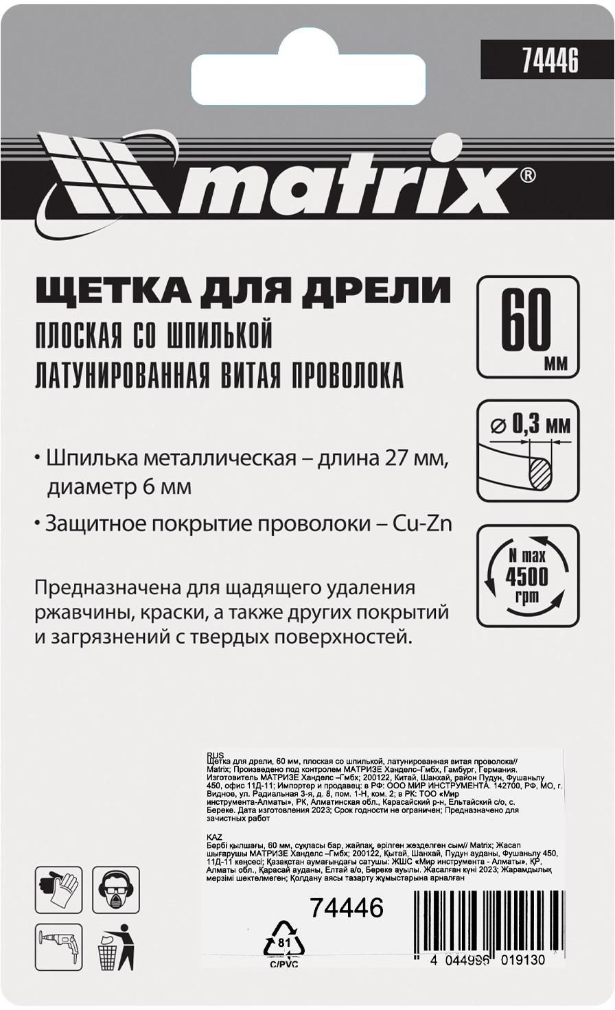Плоская щетка для дрели Matrix 74446 диаметром 60 мм, со шпилькой, с щетиной из латунированной витой проволоки, предназначена для бережной очистки металлических, деревянных, пластиковых поверхностей от загрязнений, старых лакокрасочных материалов и ржавчины.