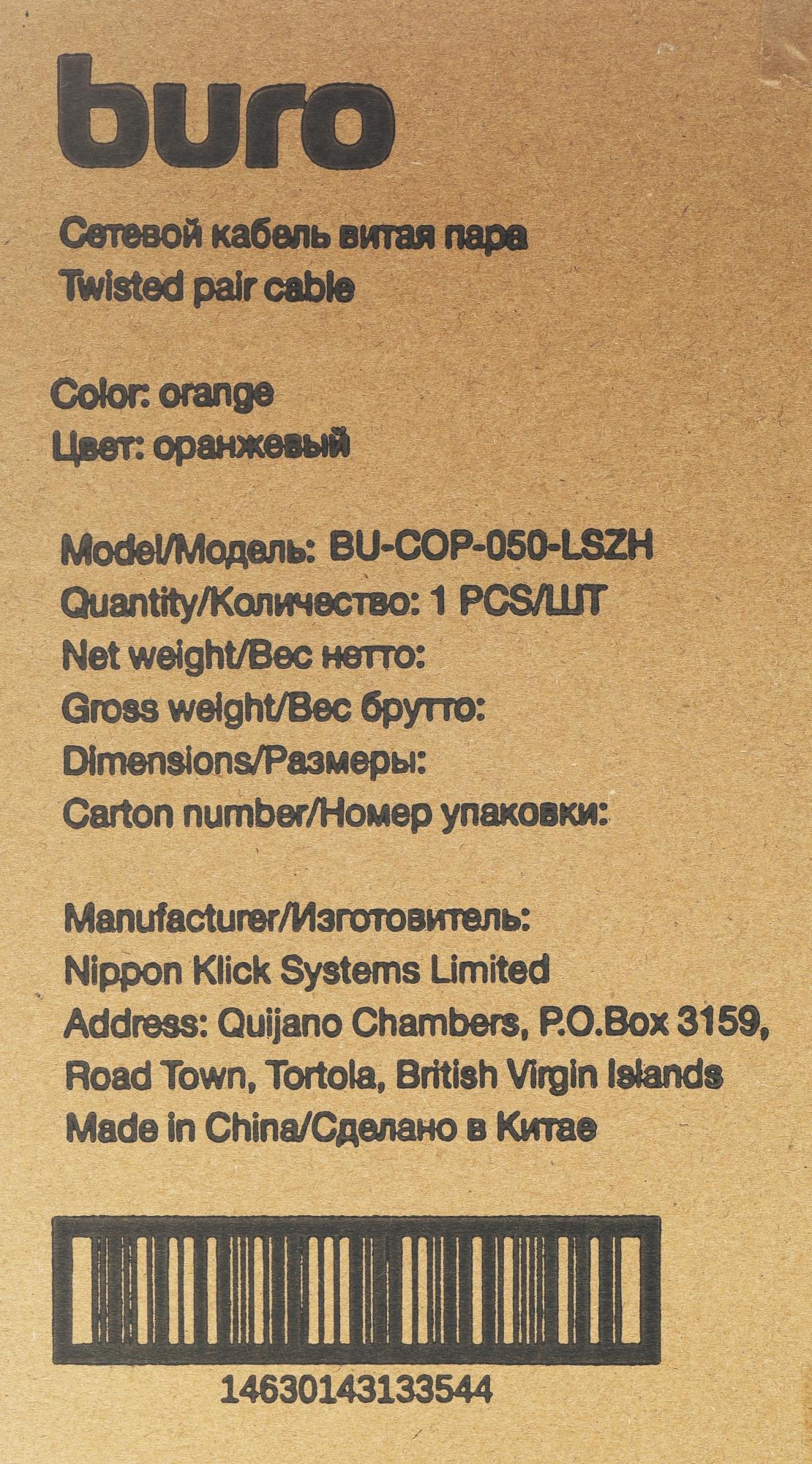 Кабель сетевой Buro BU-COP-050-LSZH UTP 4 пары cat.5E solid 0.50мм Cu 305м оранжевый