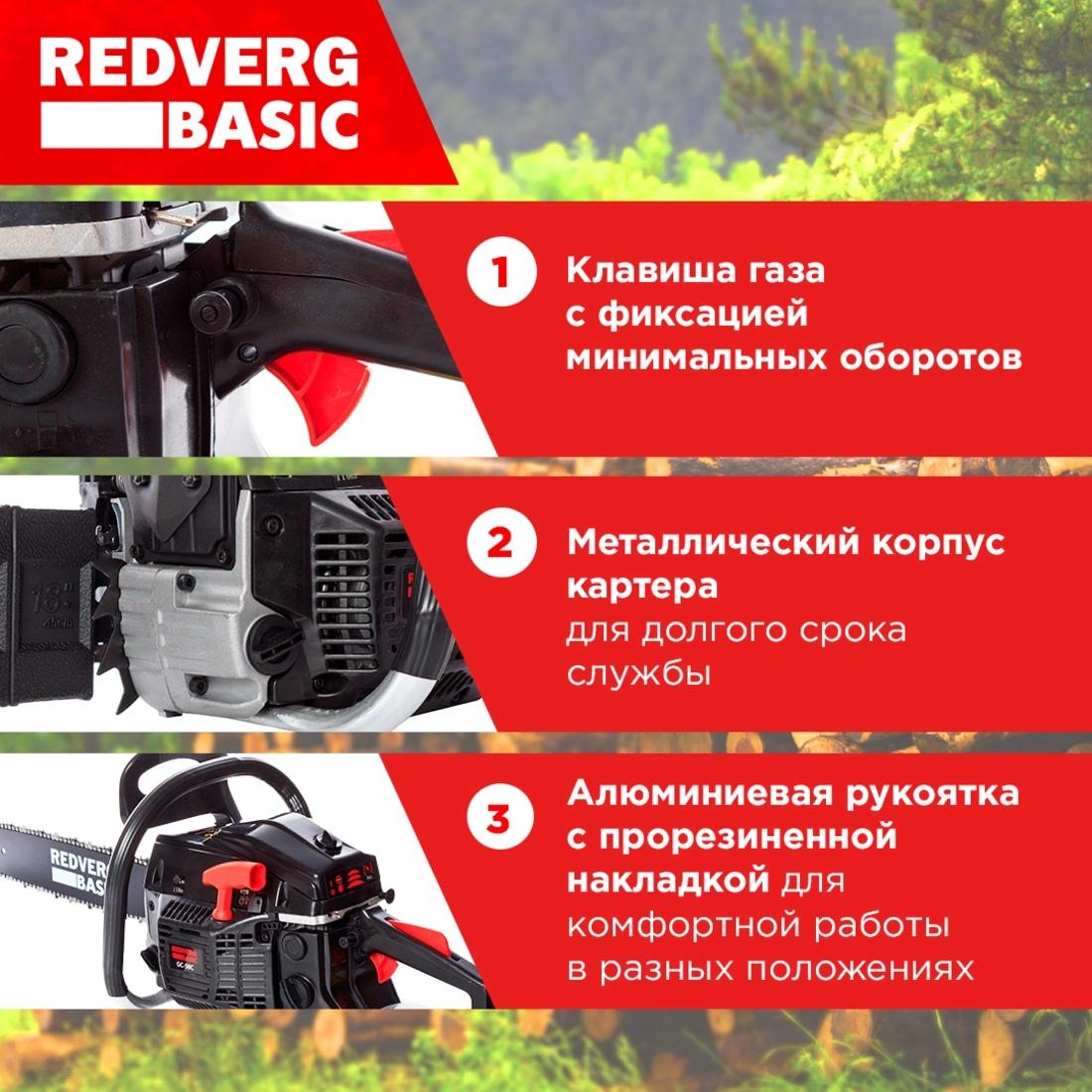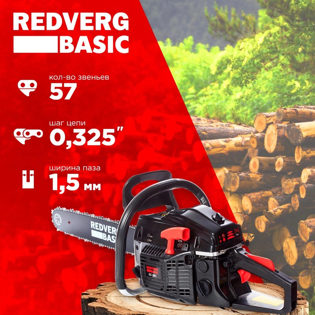 Бензопила RedVerg Basic GC-58C предназначена для распиловки стволов деревьев, веток, бревен и других заготовок из древесины с помощью специальной цепи в качестве режущего сменного инструмента.