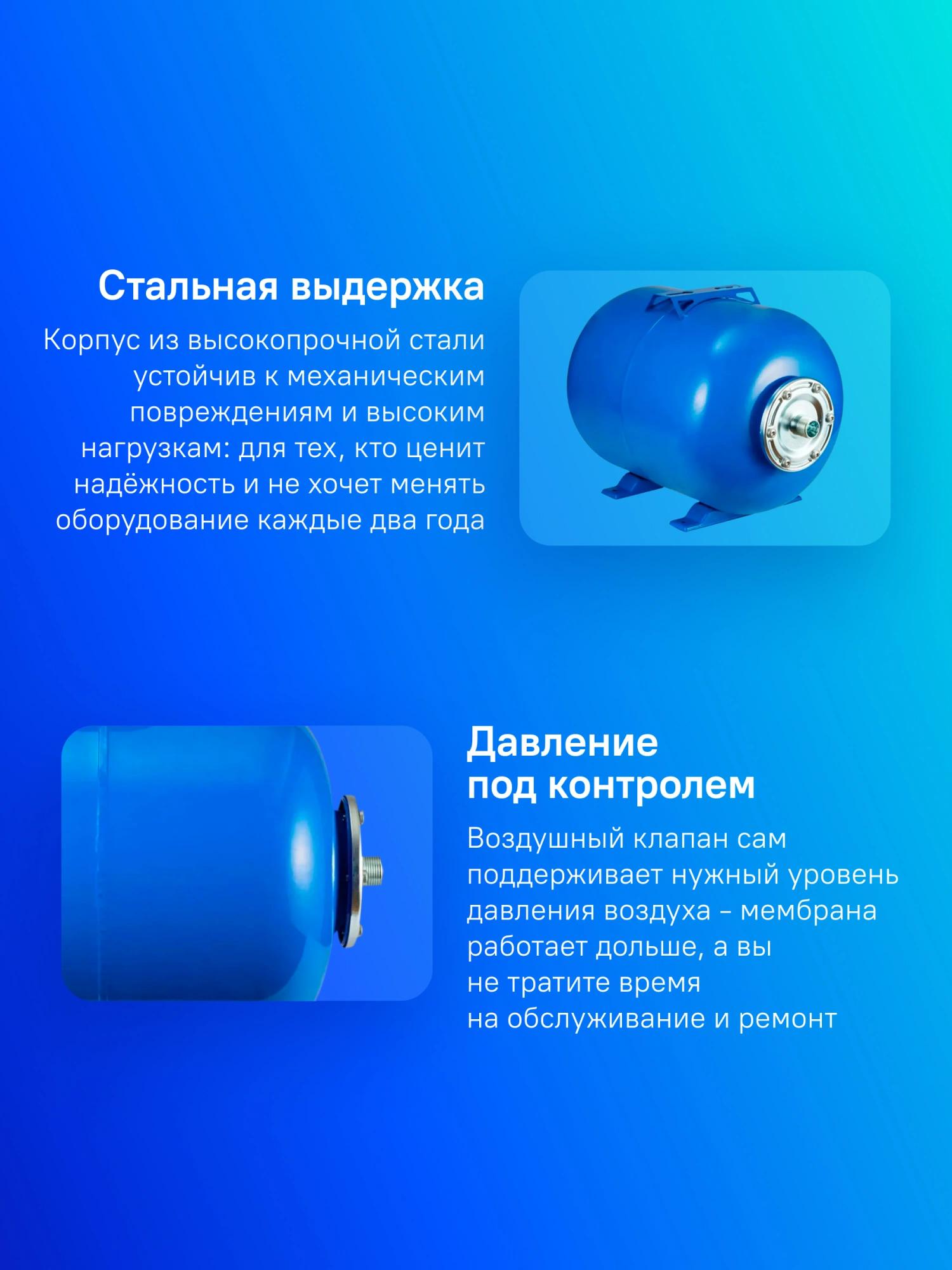 Предохраняет насос от частого включения. Снижает вероятность появления гидроудара в системе. При отключении напряжения выдает накопленный запас воды. Корпус из высококачественной стали. Воздушный клапан контроля давления воздуха. Универсальная площадка для крепления насоса. Горизонтальная компоновка