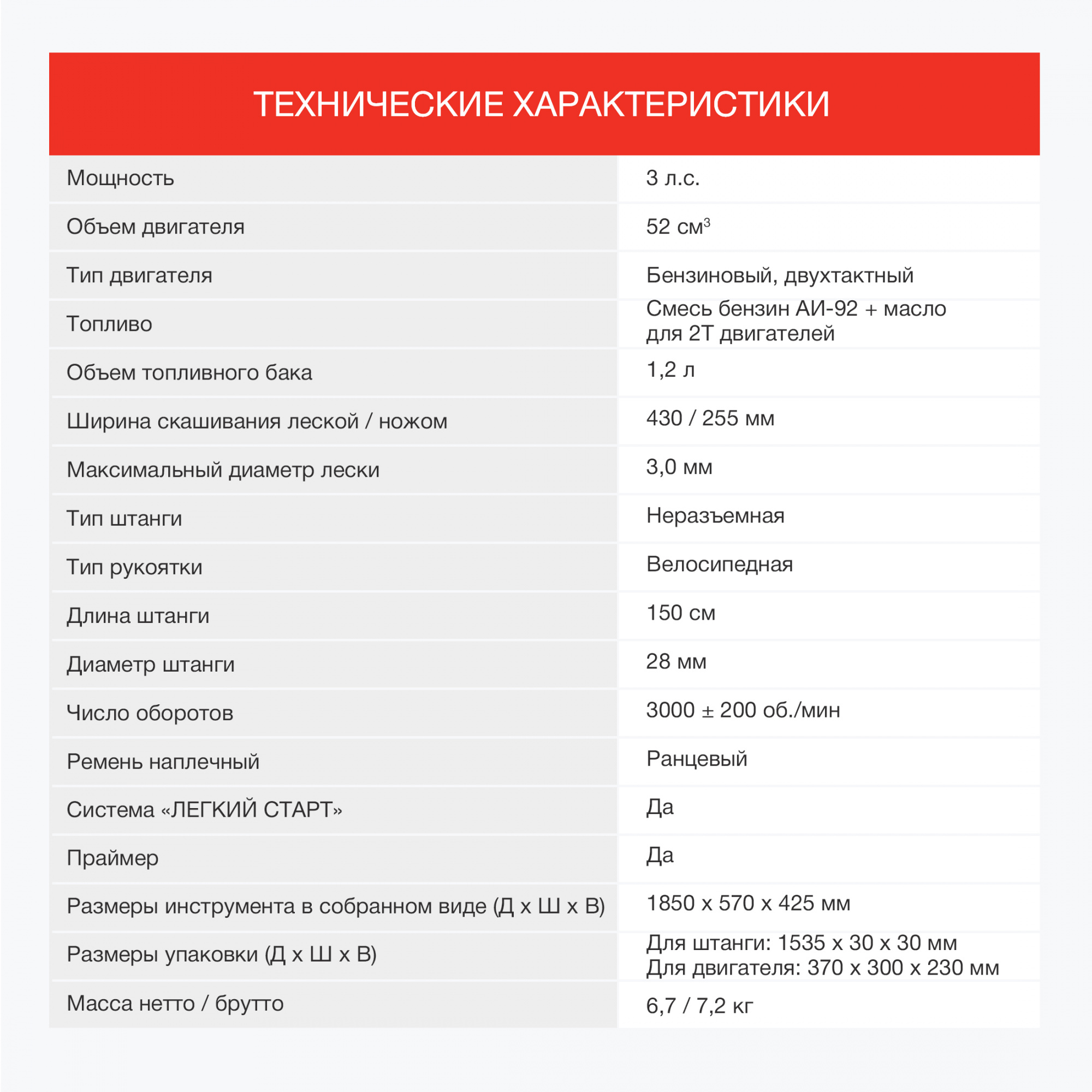 "Блок двигателя, Штанга, Комплект крепежа, Комплект рукояток, Ранцевый ремень, Защитный кожух, Бутылка, Нож, Шпуля с леской"