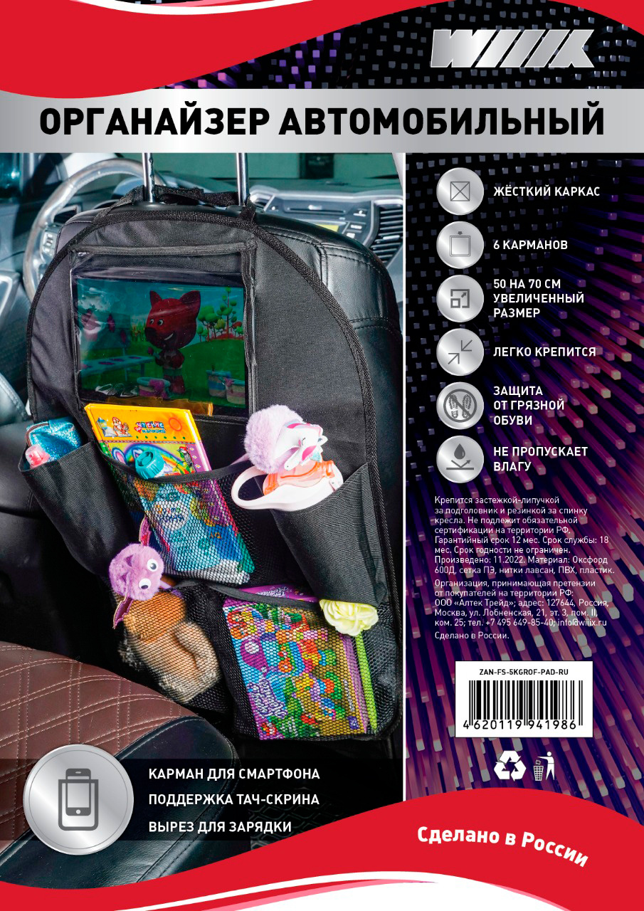 Защитная накидка-органайзер ZAN-FS-5KGROF-PAD-RU WIIIX на спинку сиденья в авто, 5 карманов(планшет)