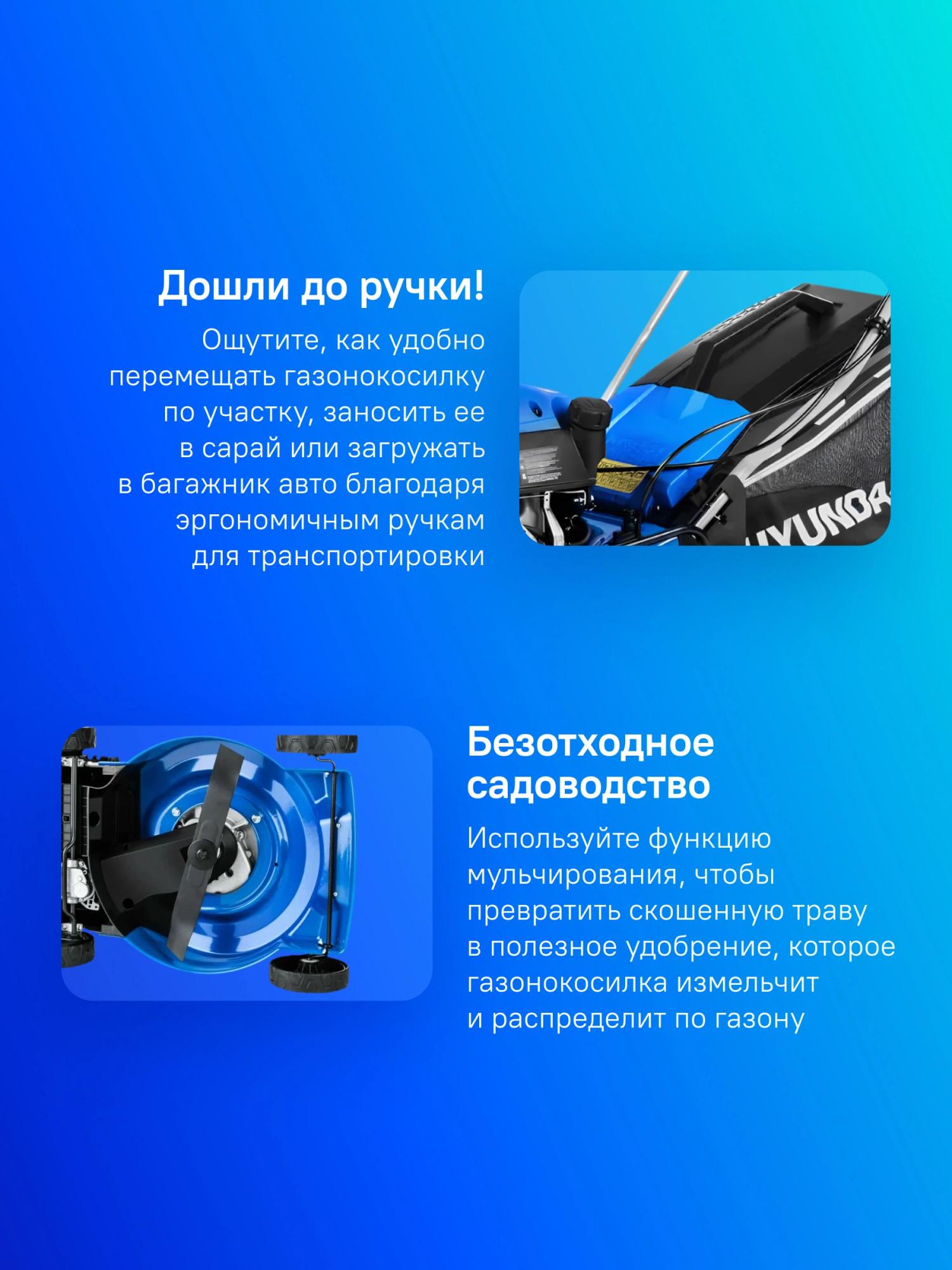 мульчирование, регулировка высоты скашивания, ручки для транспортировки, складная ручка