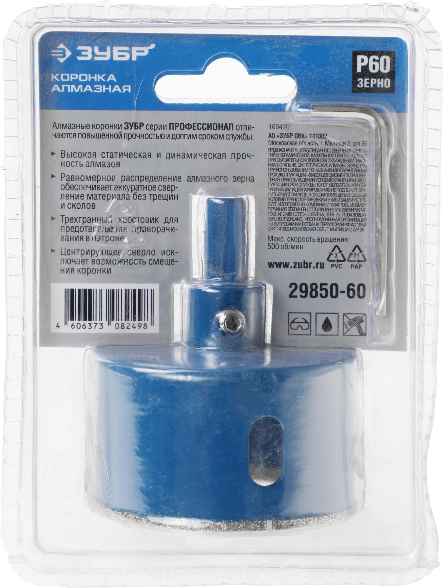 Коронка алмазная по кафелю и стеклу, d=60 мм., зерно Р 60, в сборе с центрирующим сверлом и имбусовым ключом, ЗУБР Профессионал 29850-60.