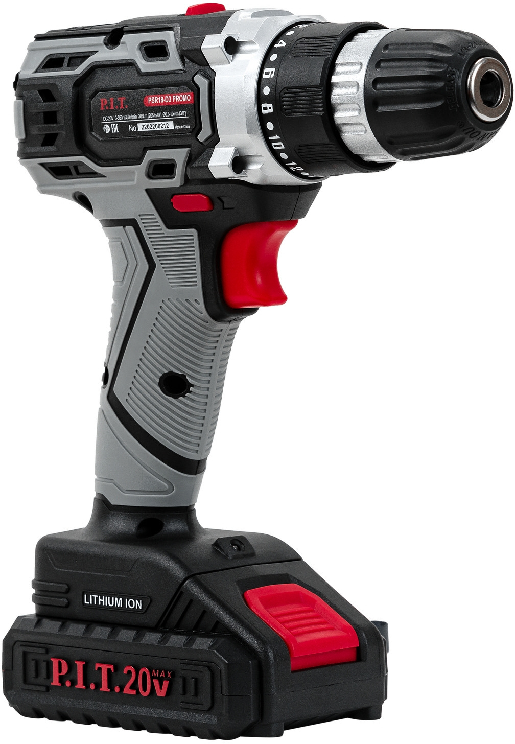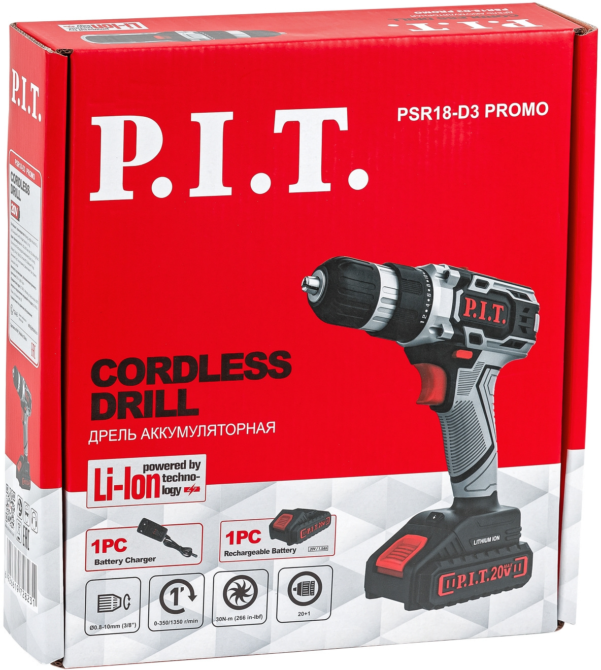 Дрель аккумуляторная, коробка, зарядное устройство, 1 аккумулятор, руководство по эксплуатации, набор бит (10 шт.), магнитный адаптер, сверло по дереву, сверло по металлу