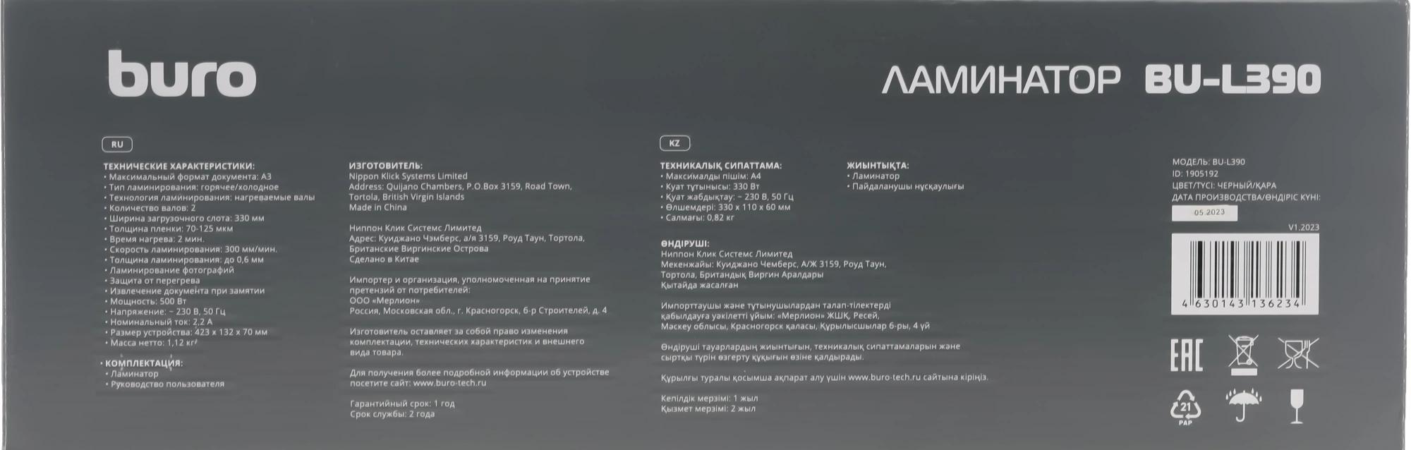 Ламинатор Buro BU-L390 черный A3 (70-125мкм) 30см/мин (2вал.) хол.лам. лам.фото