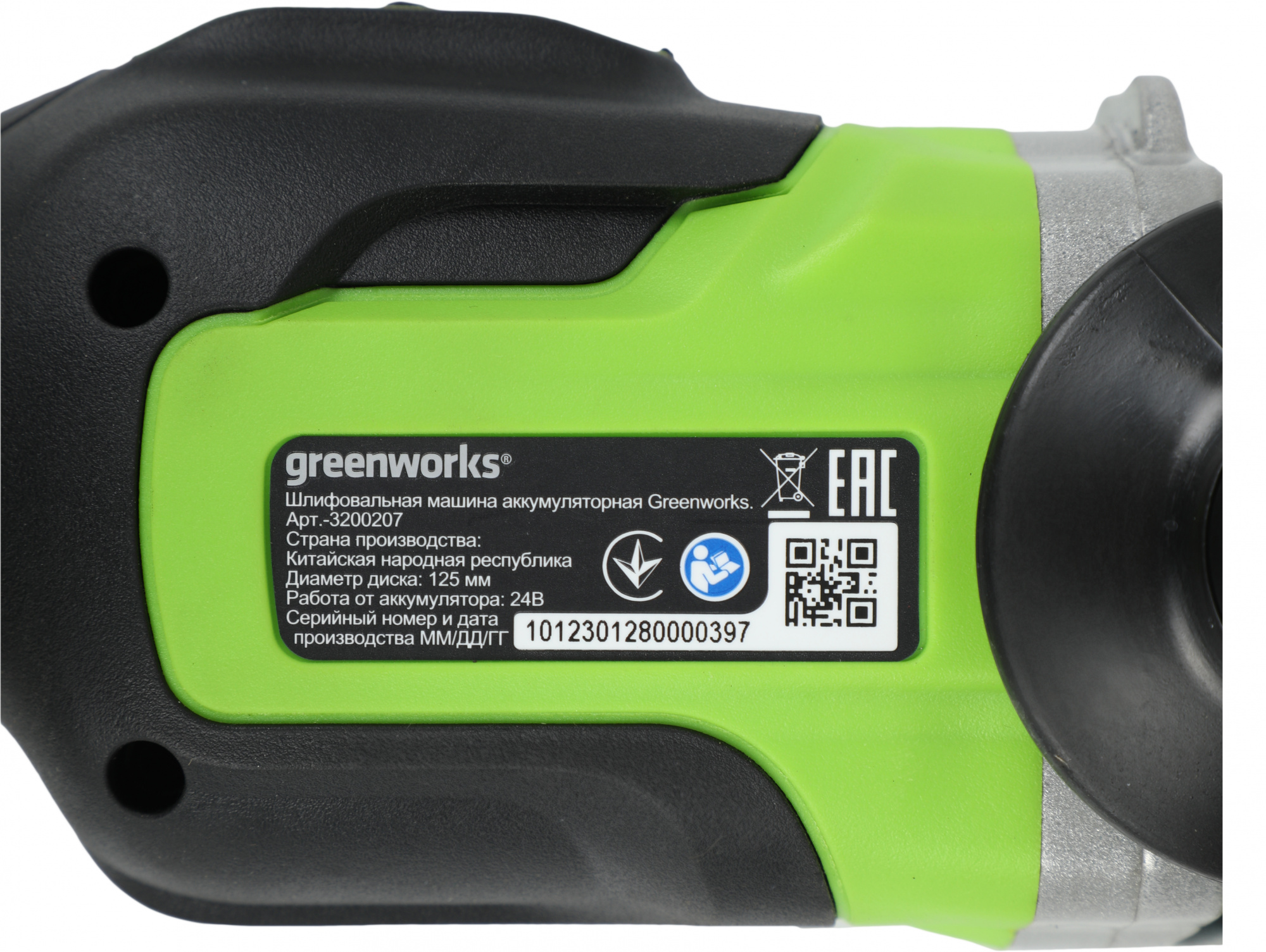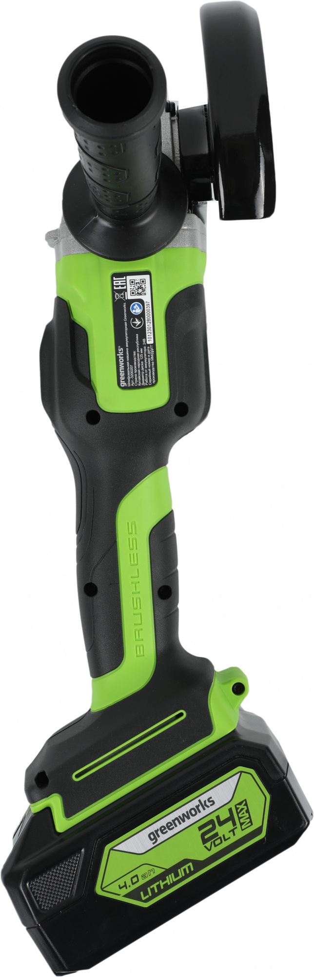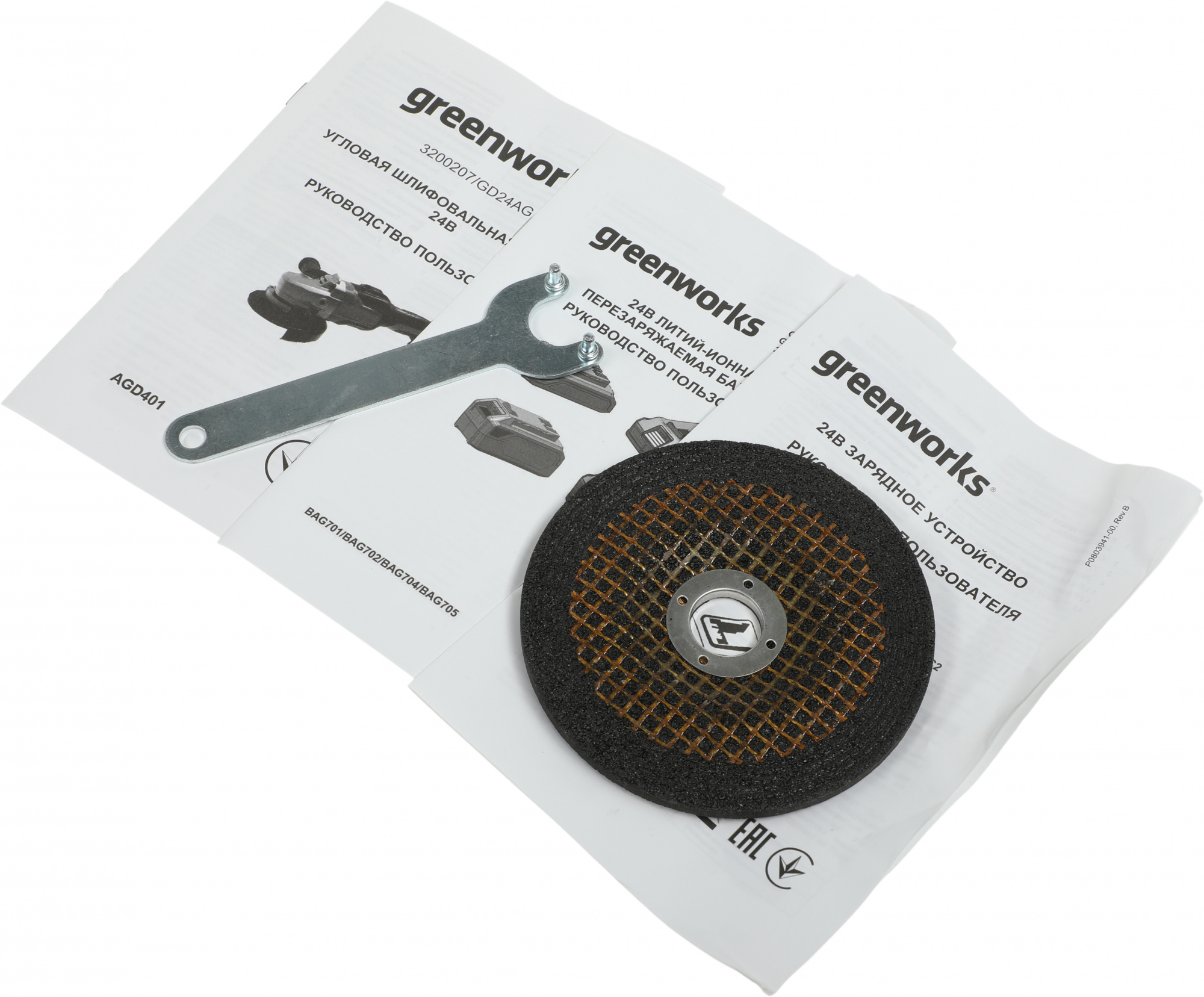 Угловая шлифовальная машина (болгарка) Greenworks 24V, арт. 3200207; боковая рукоятка; ключ для монтажа диска; аккумулятор Greenworks, 24V, 4 Ач; зарядное устройство Greenworks 24V, 4А; руководство по эксплуатации; гарантийный талон; удобная сумка-переноска.