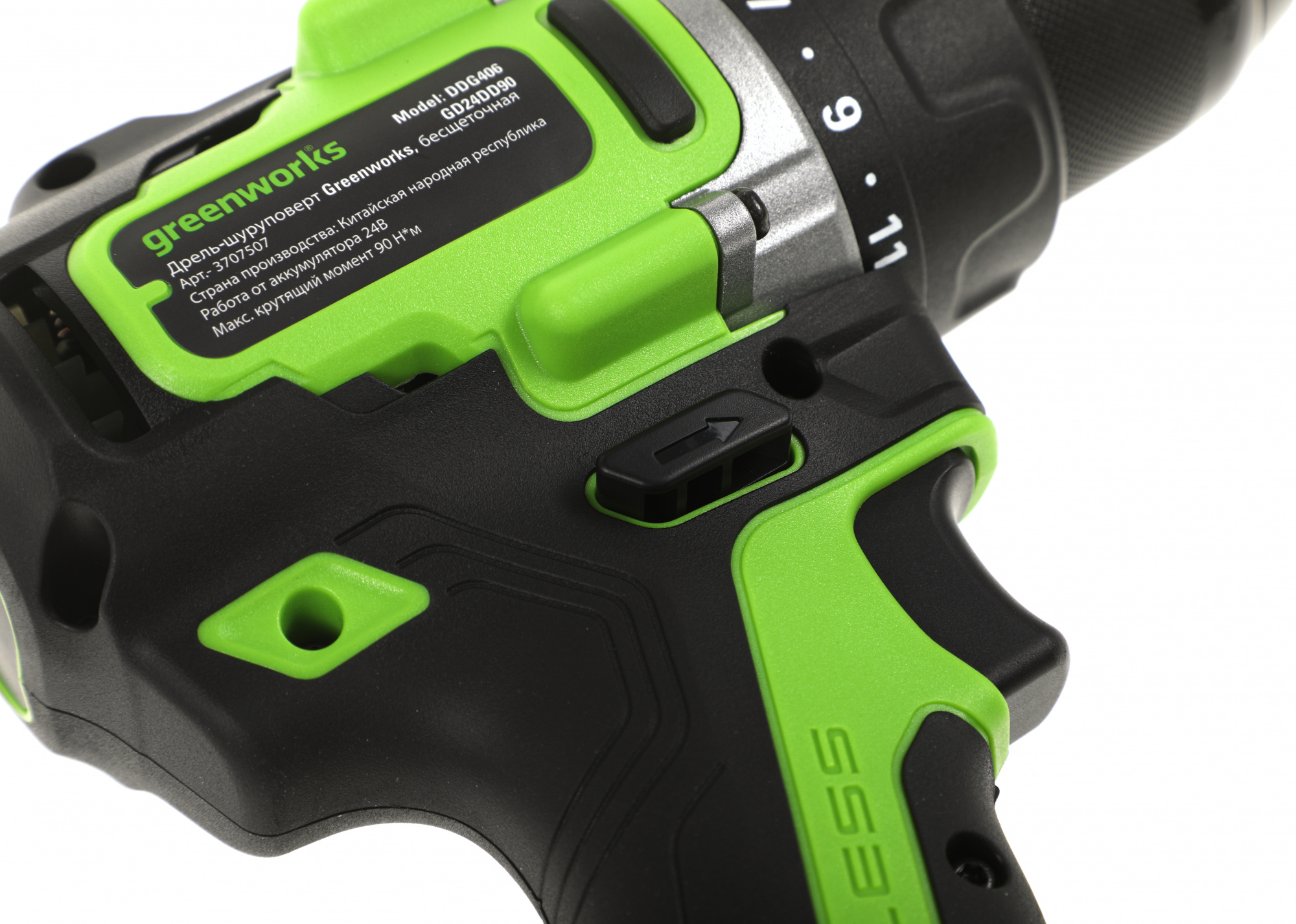 Дрель-шуруповерт аккумуляторная Greenworks GD24DD90 24V, крепеж, руководство пользователя, упаковка.
