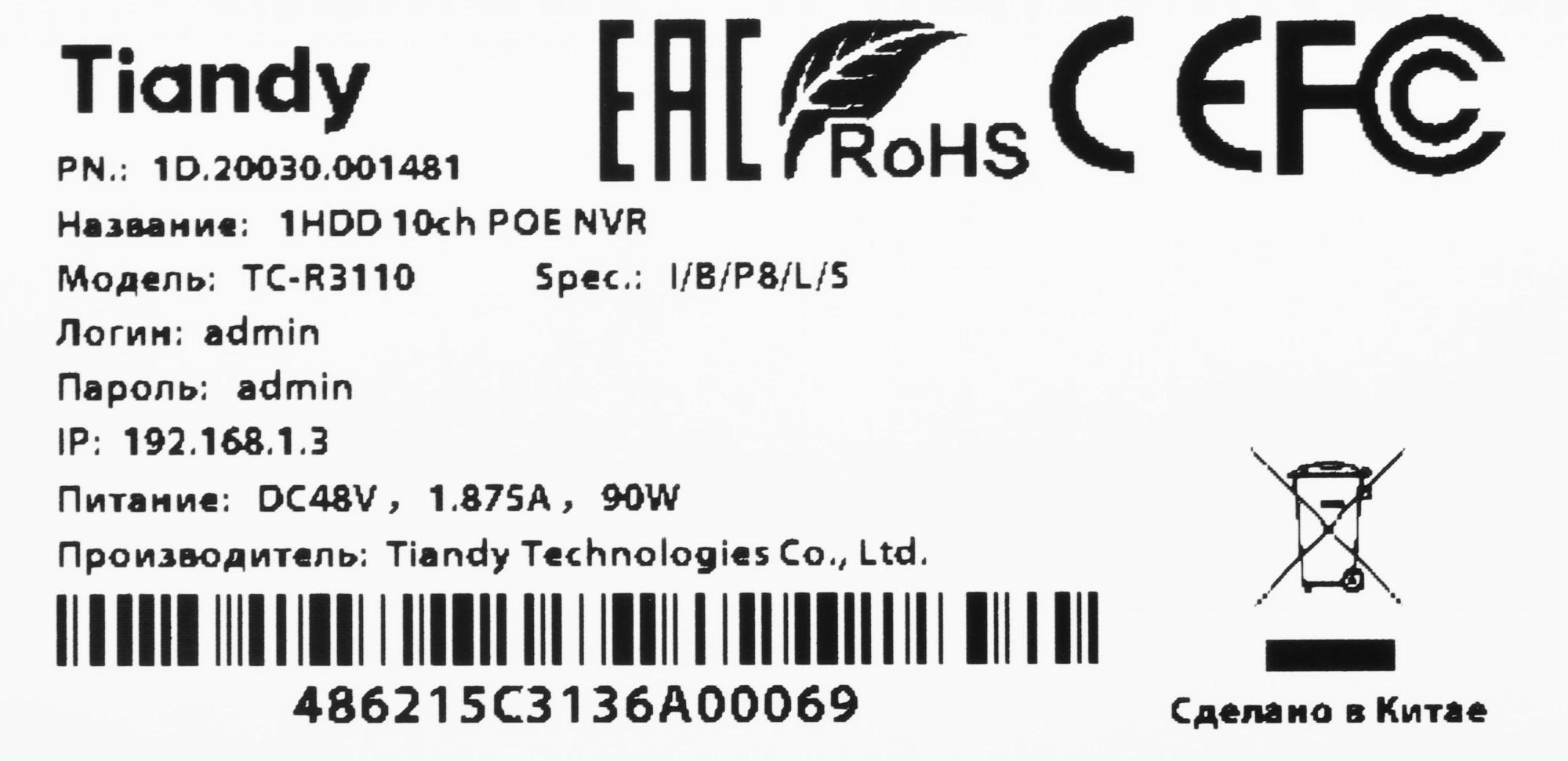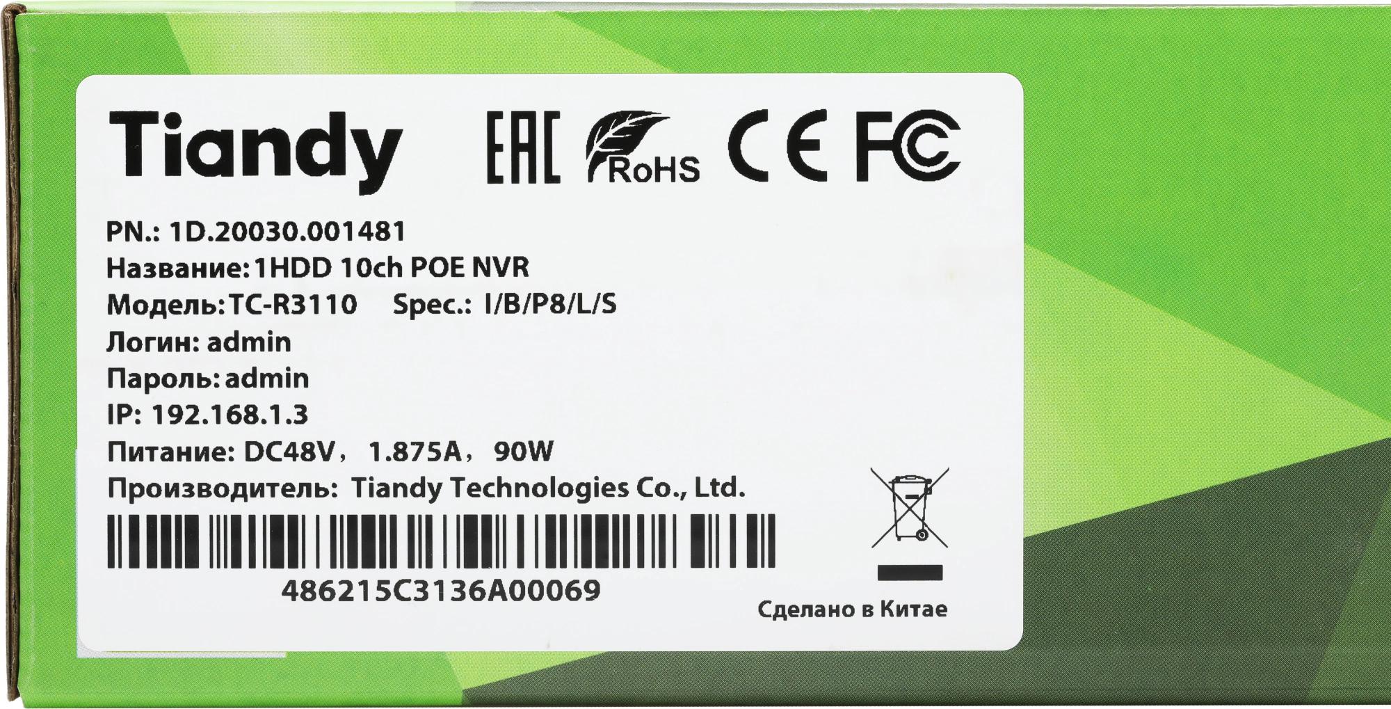 Видеорегистратор Tiandy TC-R3110 I/B/P8/L/S