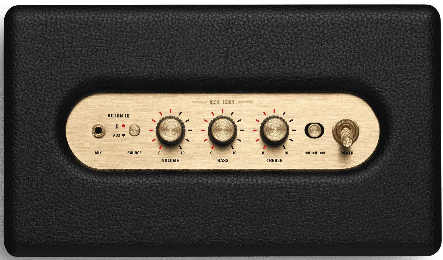Кнопка выбора источника (Bluetooth или вход 3.5мм). Ручка питания/громкости. Регулятор низких частот. Регулятор высоких частот. Кнопка воспроизведения/паузы. Ручка управления переходом назад/вперед