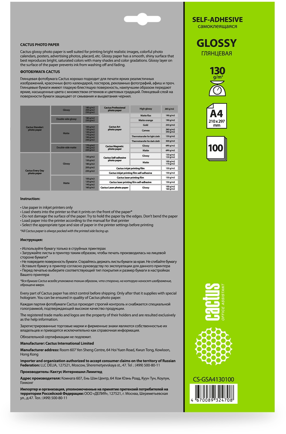 Фотобумага Cactus CS-GSA4130100 A4/130г/м2/100л. глянцевое самоклей. для струйной печати