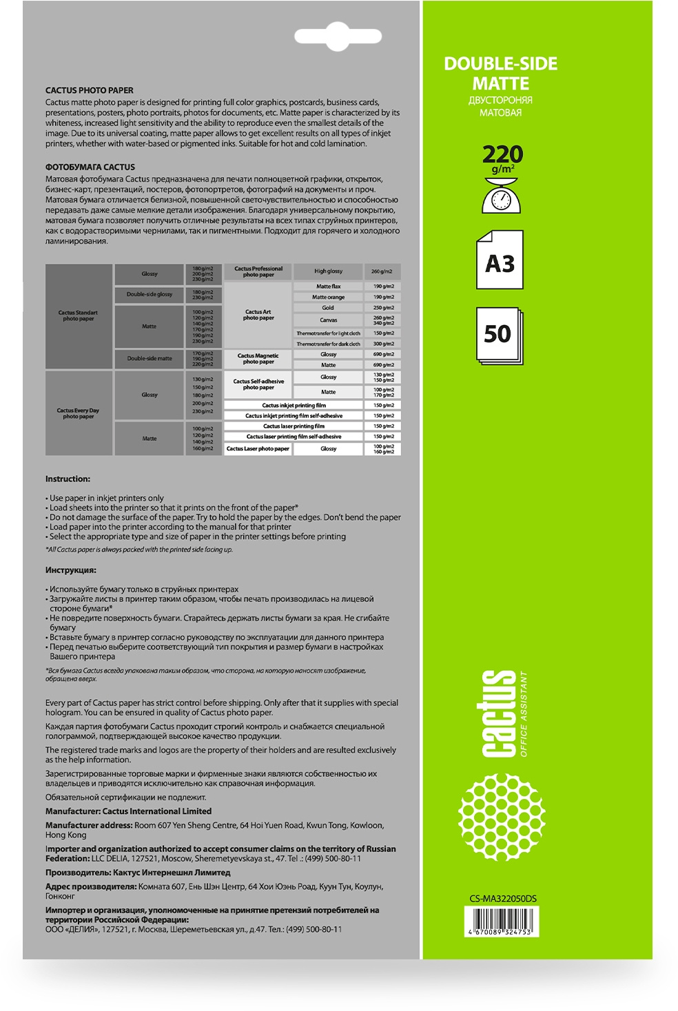 Фотобумага Cactus CS-MA322050DS A3/220г/м2/50л./белый матовое/матовое для струйной печати