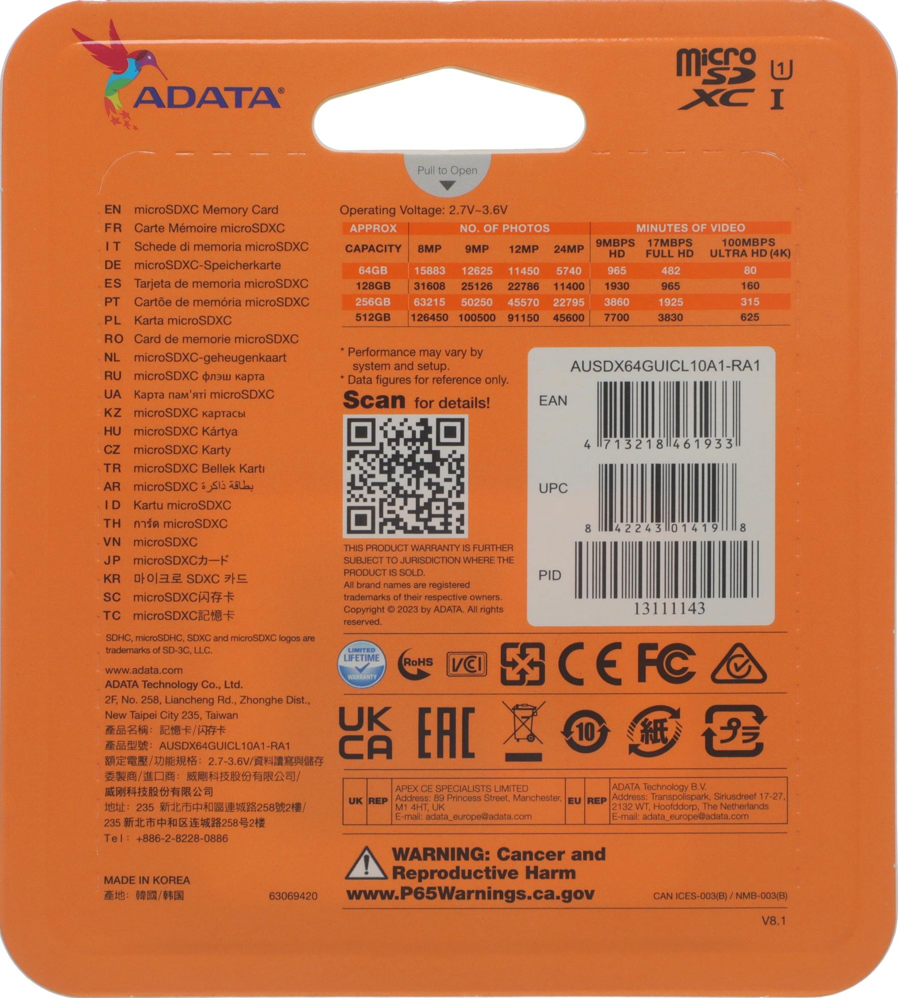 Флеш карта microSDXC 64GB A-Data AUSDX64GUICL10A1-RA1 Premier + adapter