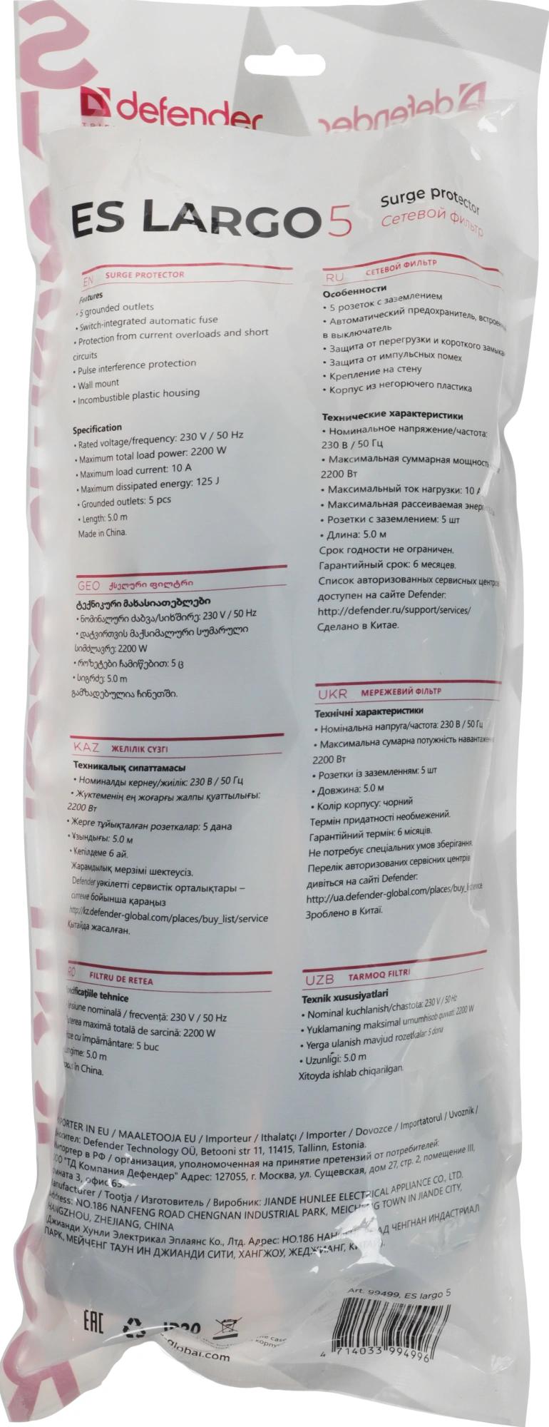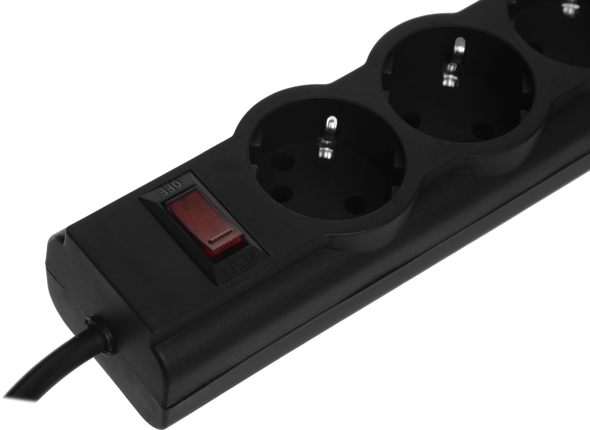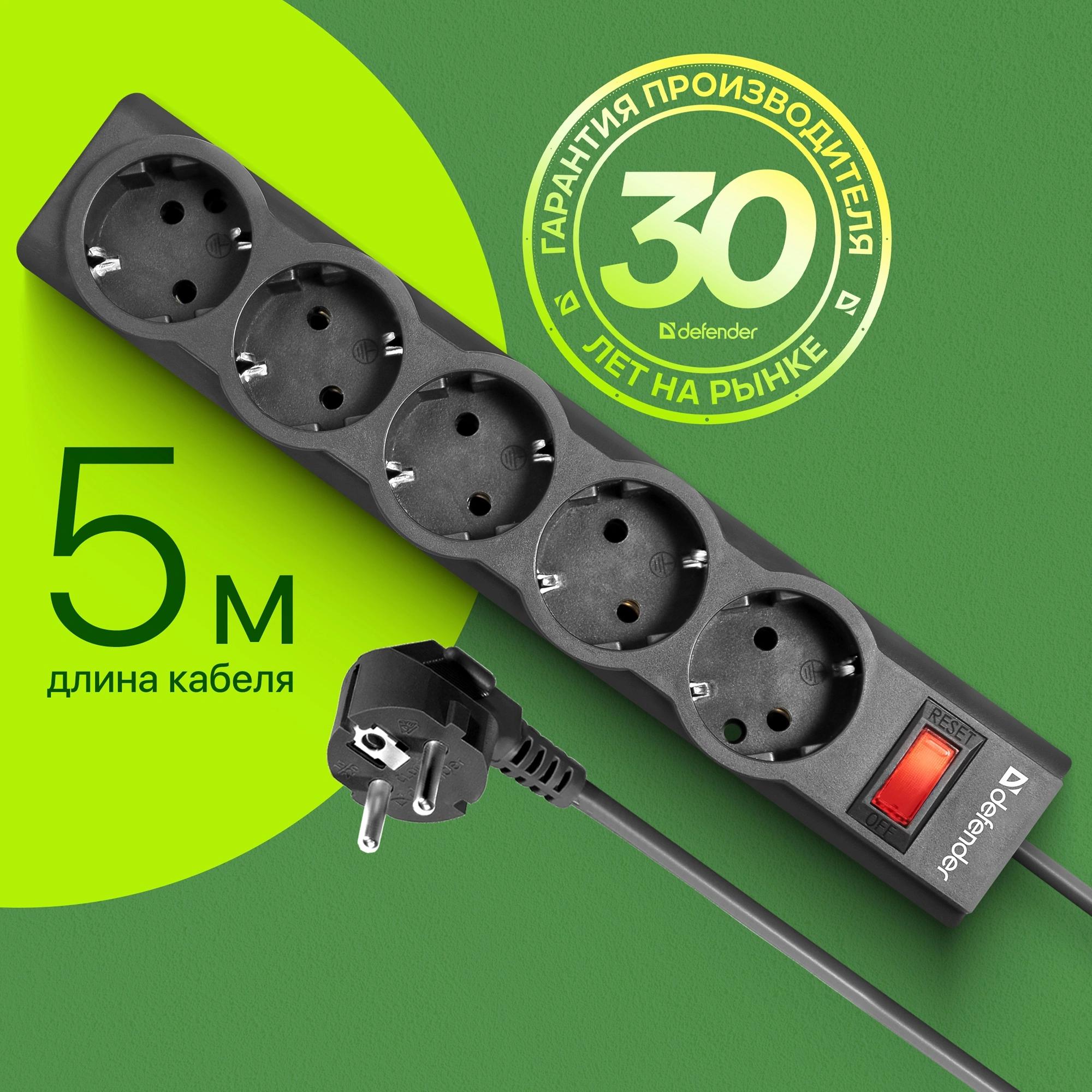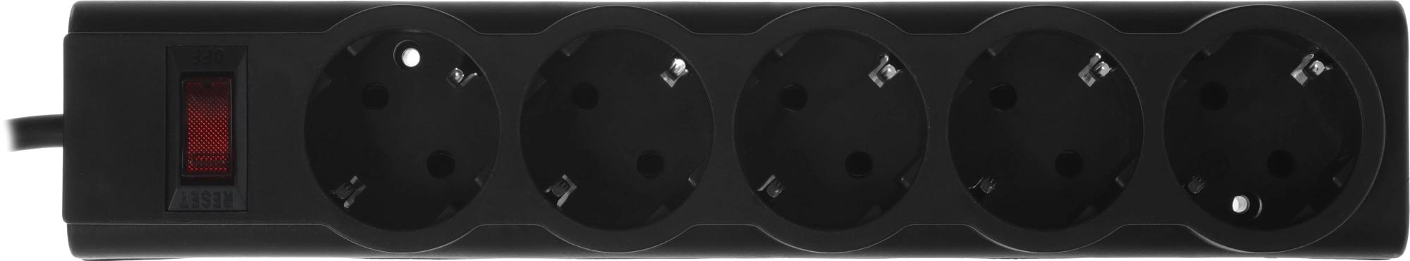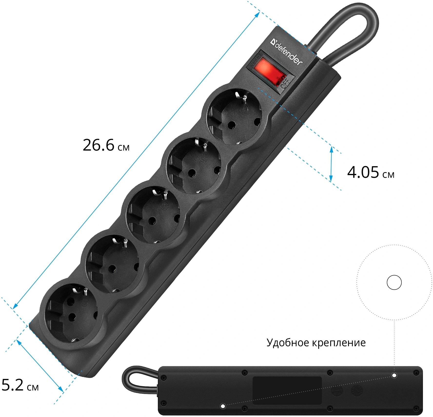 5 розеток с заземлением. Автоматический предохранитель, встроенный в выключатель. Защита от перегрузки и короткого замыкания. Защита от импульсных помех. Индикатор сети. Крепление на стену. Корпус из негорючего пластика.