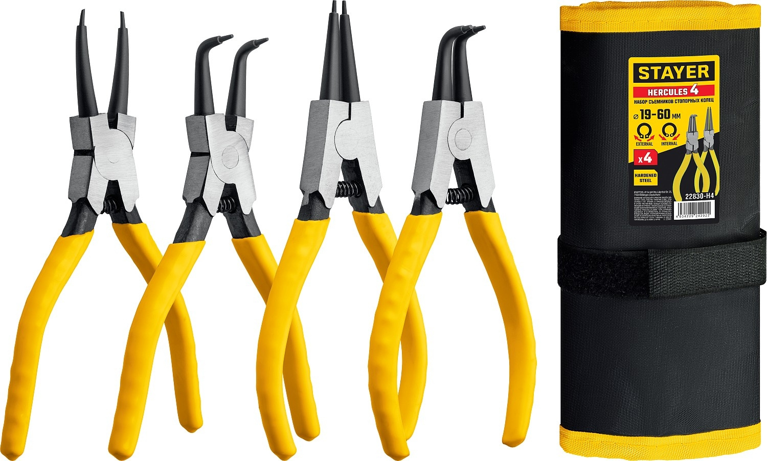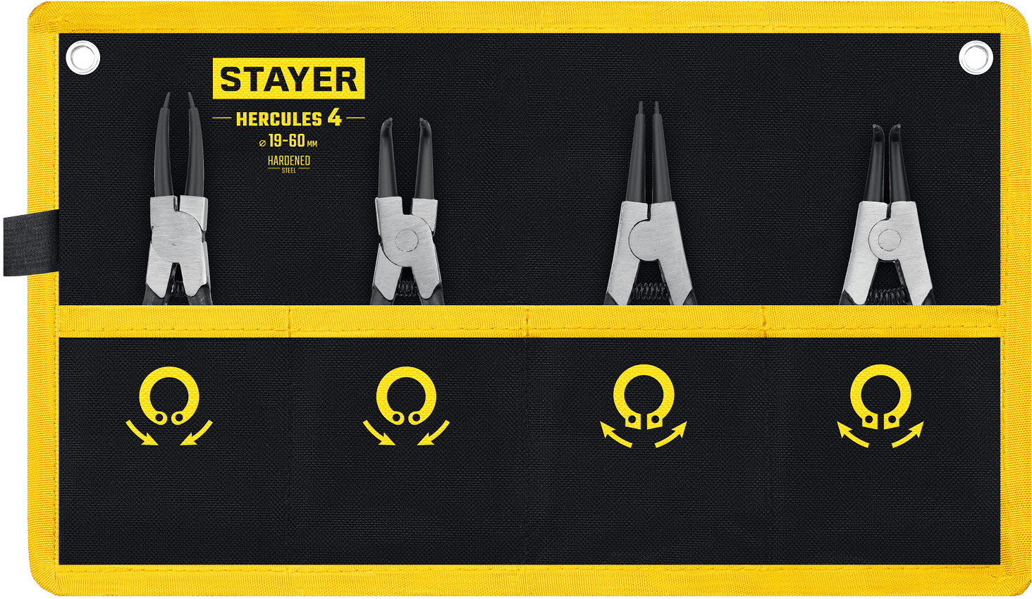 Набор съемников стопорных колец 19-60 мм., изготовленых из хромованадиевой стали со специальным антикоррозиойным покрытием