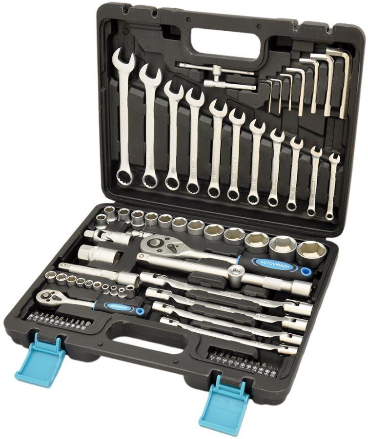 Набор инструмента (77 предметов, 1/2 1/4 DR, CrV) AUTOVIRAZH AV-212077 используется во время проведения ремонтных или слесарно-монтажных работ.