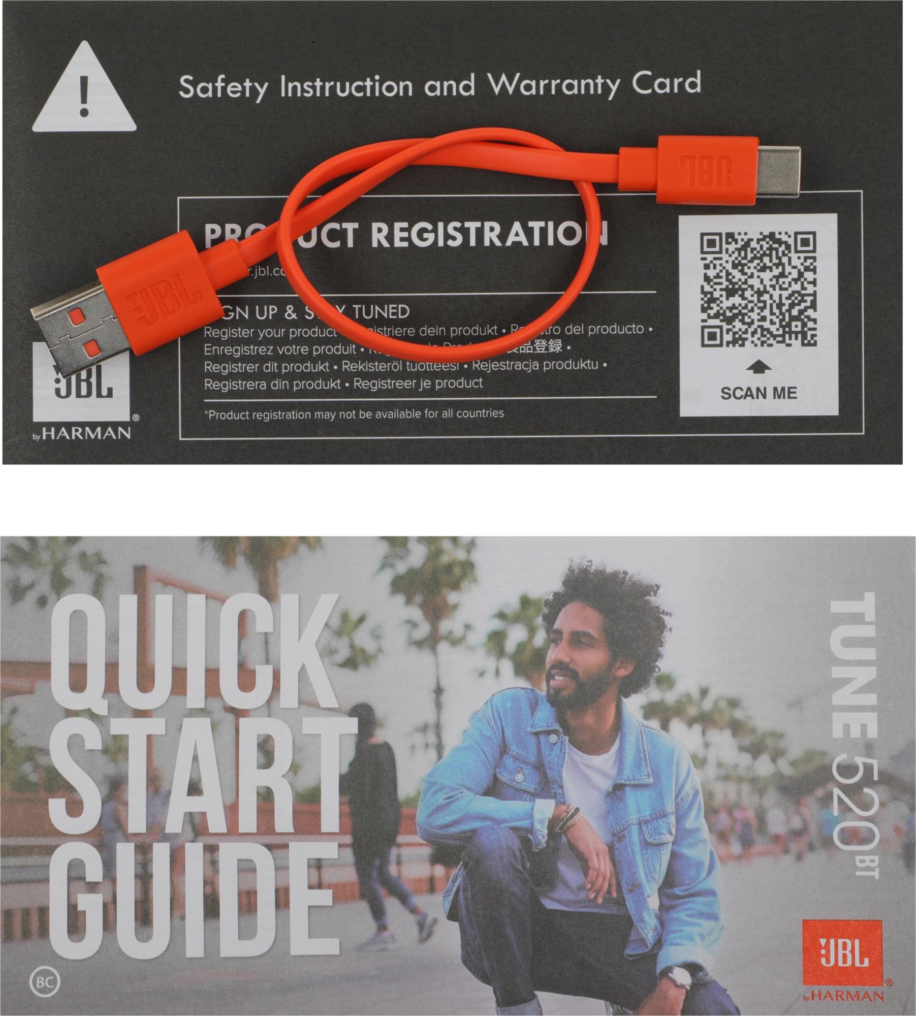 гарнитура JBL Tune 520BT, кабель зарядки, документация