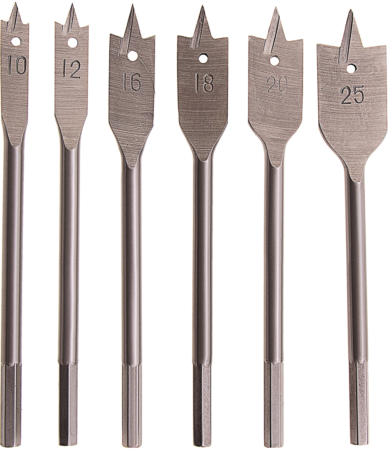 Набор сверл перовых по дереву, 10-12-16-18-20-25 мм, 6 шт. 6-гранный хвостовик.