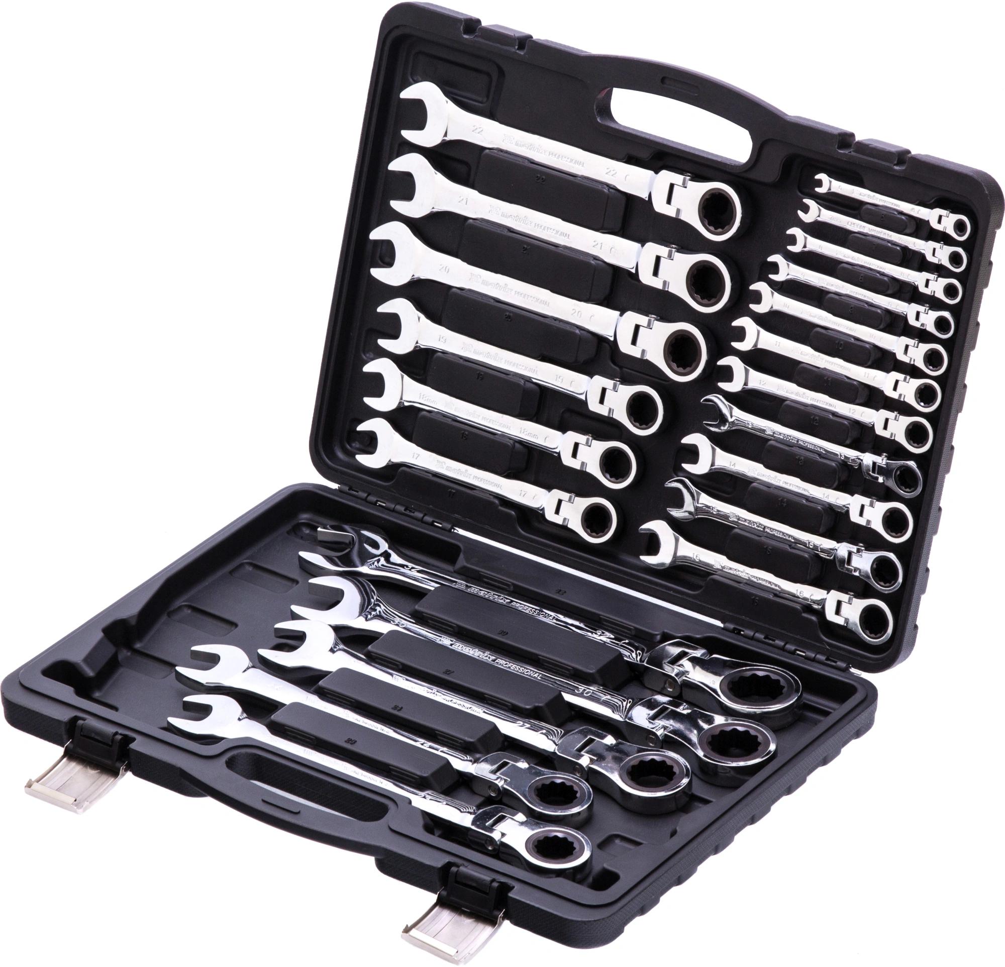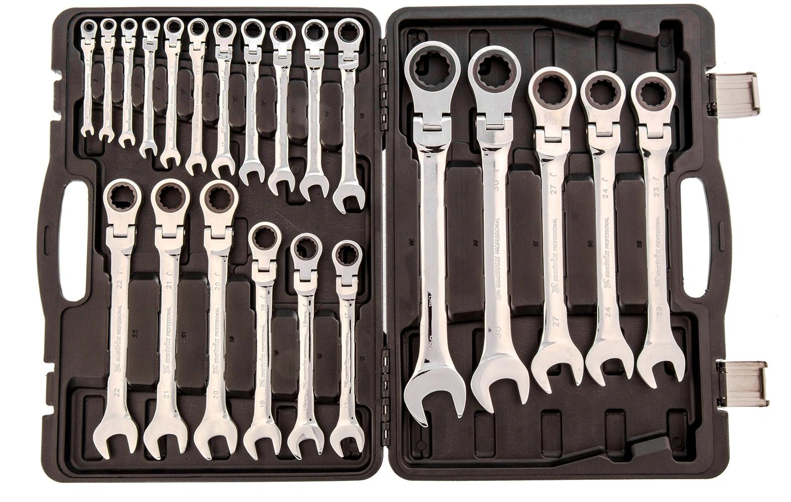 Набор ключей комбинированных, трещоточных шарнирных 22 шт. В наборе 22 ключа на 6, 7, 8, 9, 10, 11, 12, 13, 14, 15, 16, 17, 18, 19, 20, 21, 22, 23, 24, 27, 30, 32 мм. с нанесенной на корпус маркировкой типоразмера.