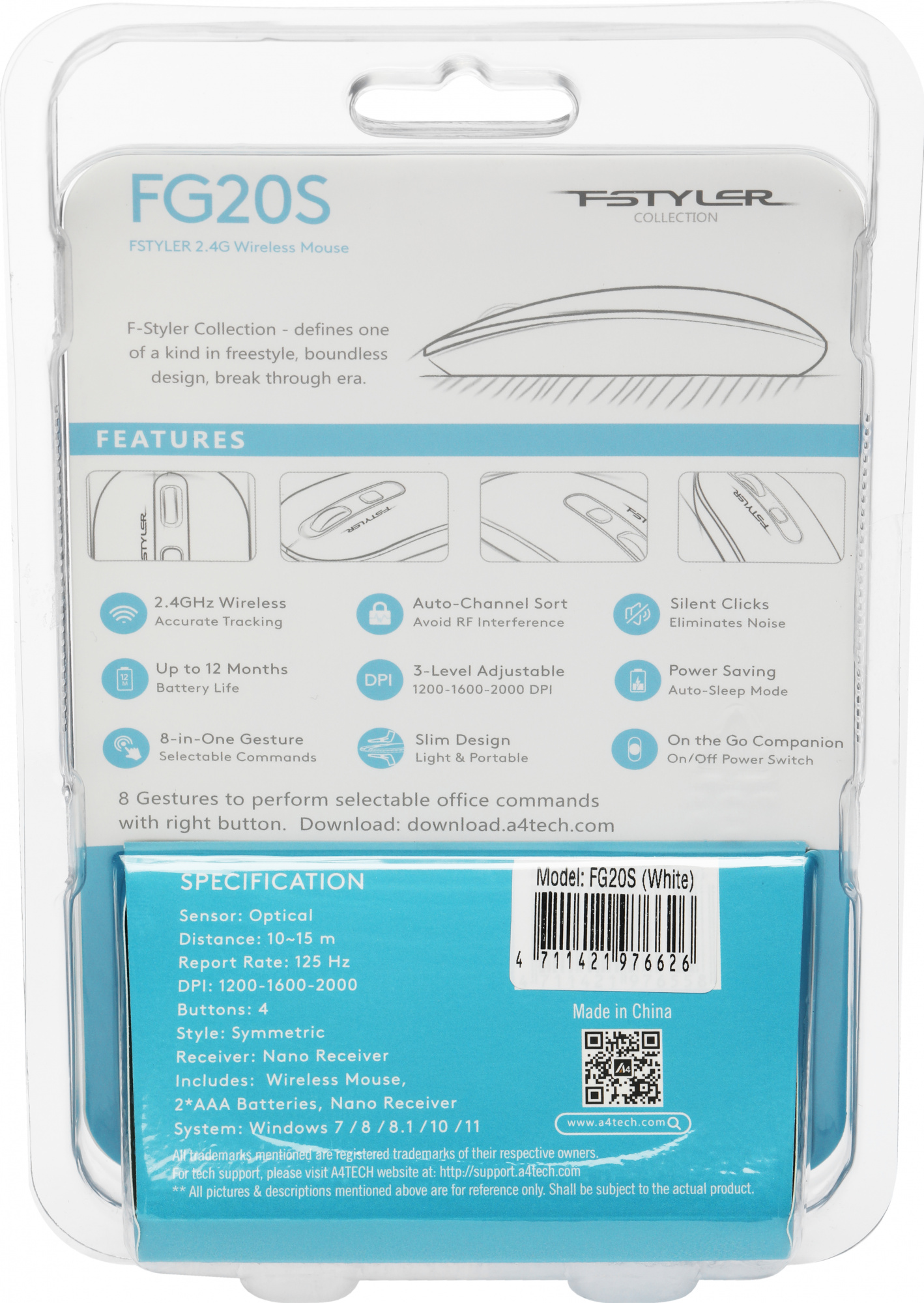 Мышь A4Tech Fstyler FG20S белый/серый оптическая 2000dpi silent беспров. USB для ноутбука 3but (FG20S USB WHITE)