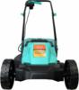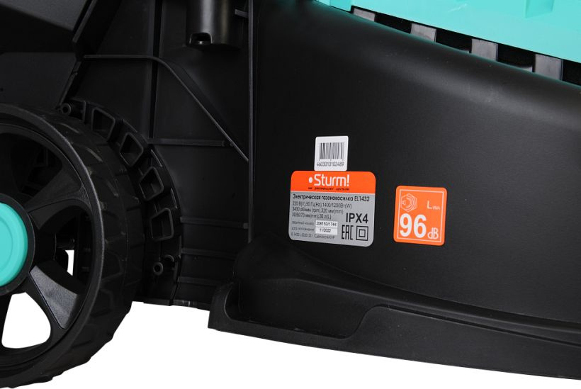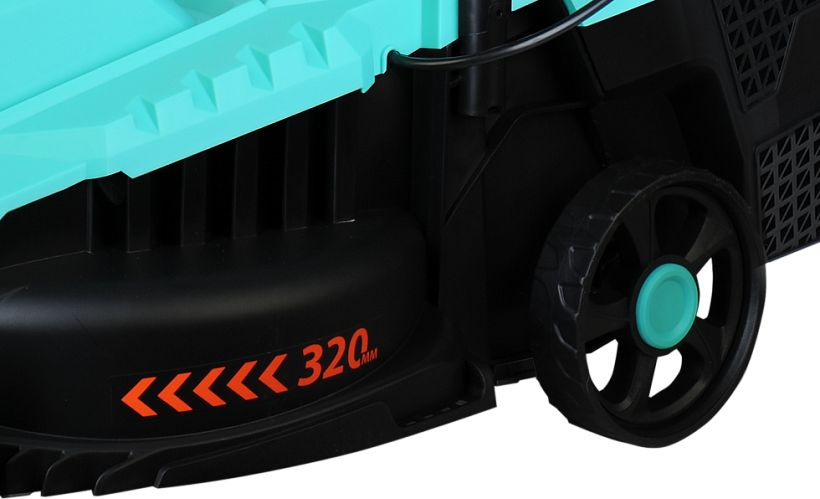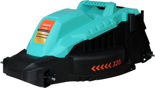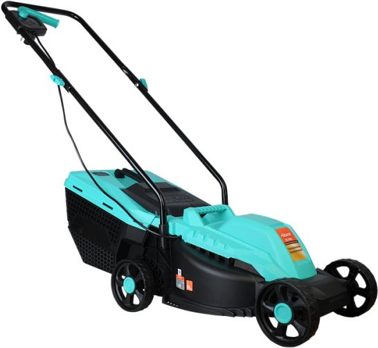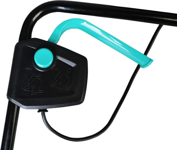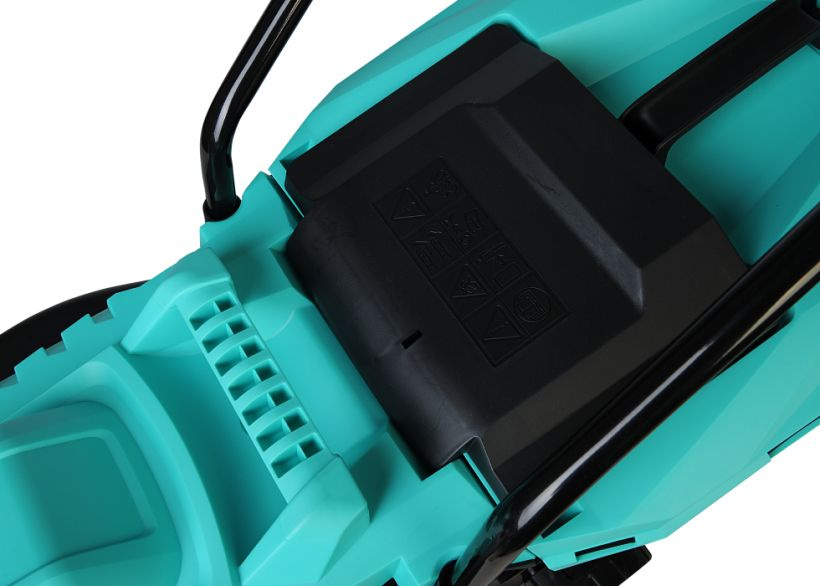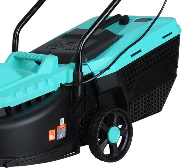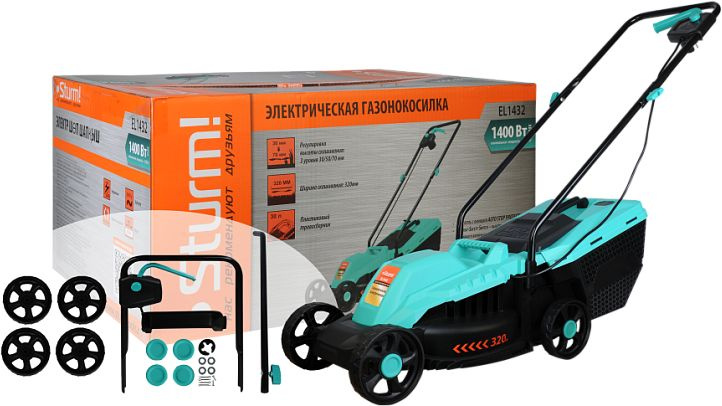 Газонокосилка, травосборник, рукоятка с набором крепежа, фиксаторы силового кабеля, инструкция по эксплуатации.