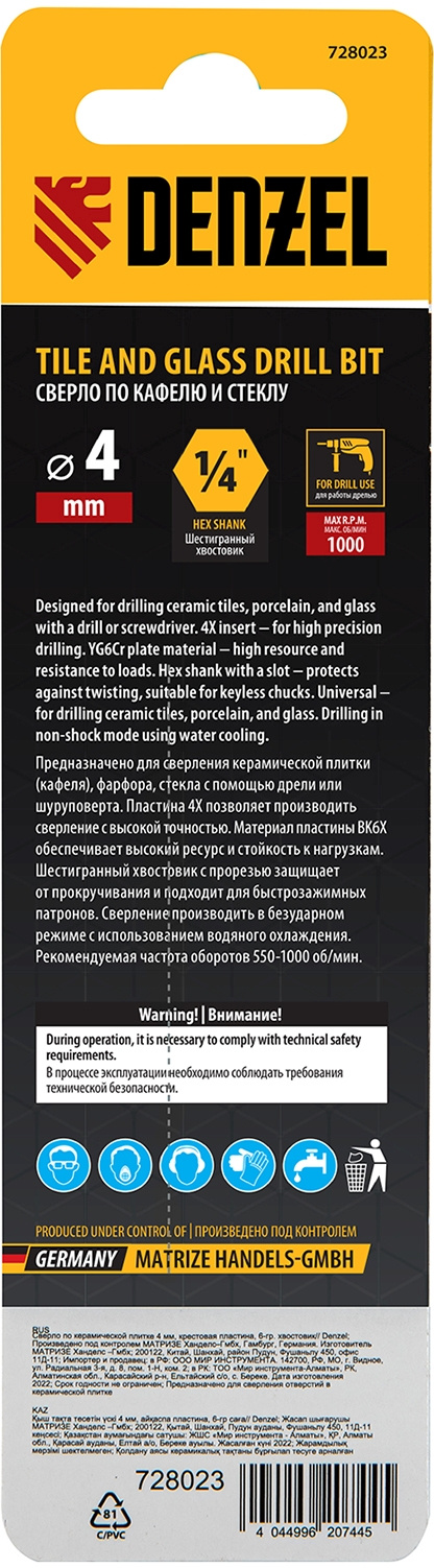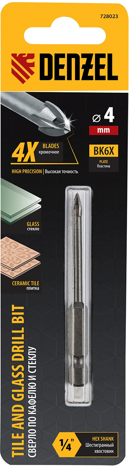 Сверло Denzel 728023 по плитке Д=4мм (1пред.) для дрелей