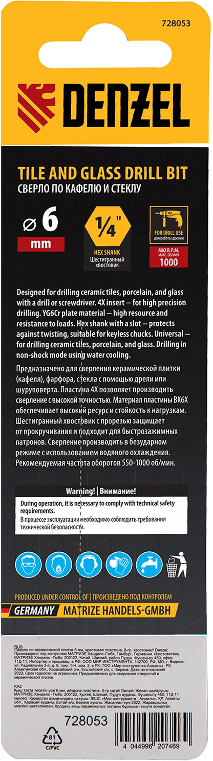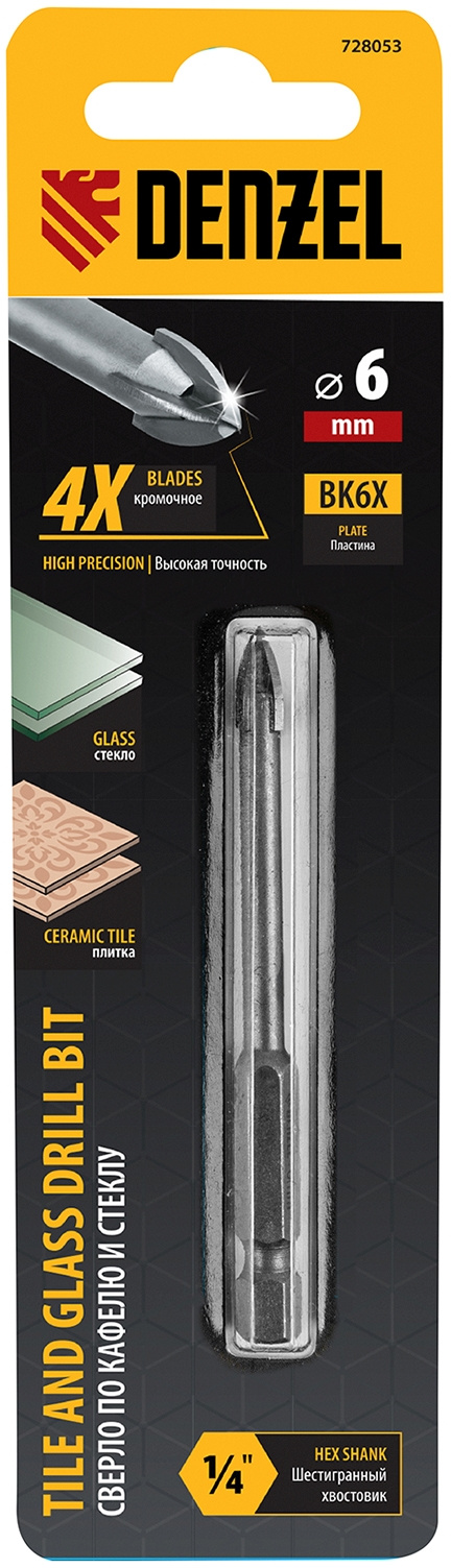 Сверло Denzel 728053 по плитке Д=6мм (1пред.) для дрелей