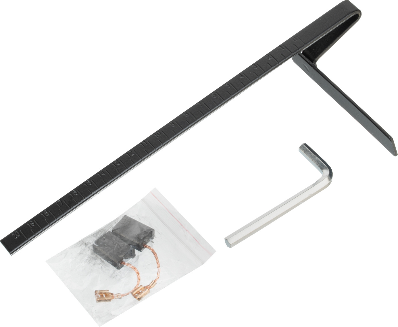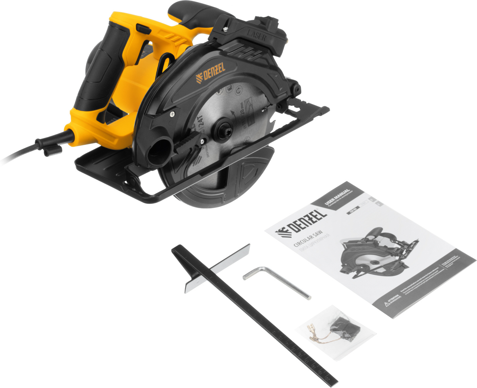 Пила циркулярная, ключ для снятия диска, параллельная направляющая, пильный диск по дереву, элементы питания ААА - 2 шт., комплект запасных угольных щёток, инструкция по эксплуатации с гарантийным талоном.
