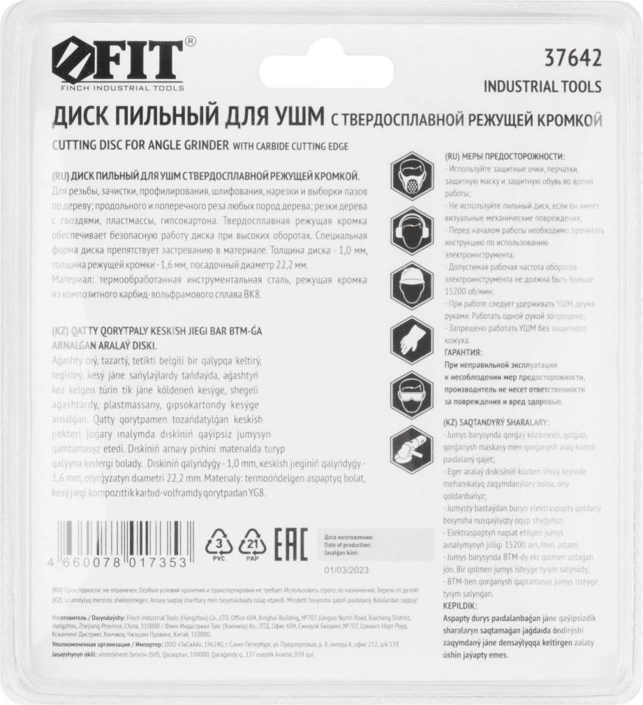 Диск пильный по дер. FIT 37642 d=125мм d(посад.)=22.2мм (угловые шлифмашины)
