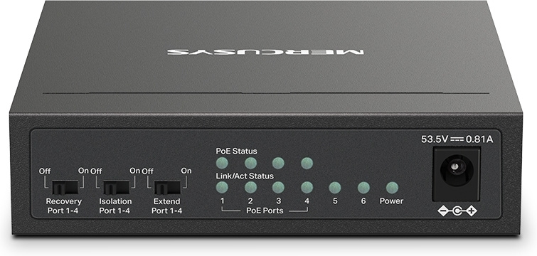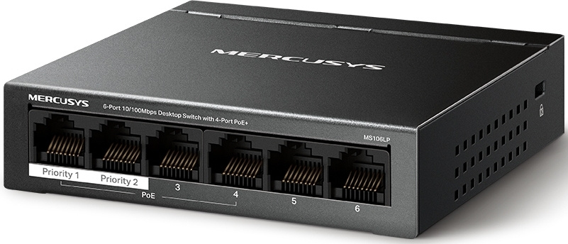 Шесть портов: 6 портов RJ45 10/100 Мбит/с.Четыре порта PoE+: позволят подавать питание и передавать данные по одному кабелю.Бюджет PoE: бюджет на один порт составляет 30 Вт, а общий бюджет — 40 Вт.Два порта Uplink: один — для подключения к интернету, к сетевому видеорегистратору.