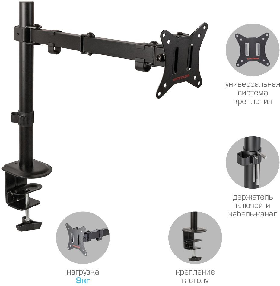 Регулируемое по высоте крепление, Мощная стальная конструкция , Кабель-каналы, Съемная монтажная пластина, Надёжное крепление к столу