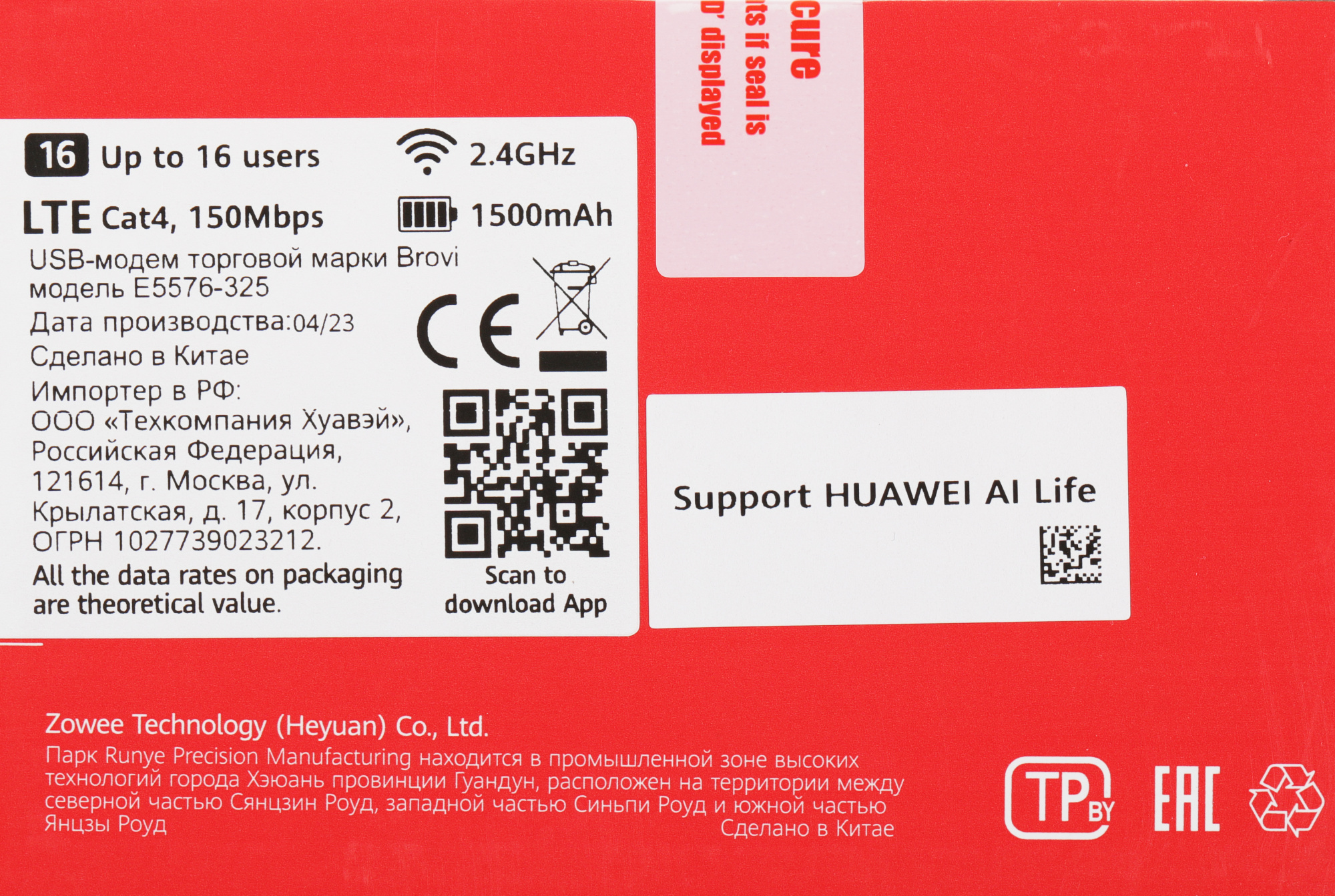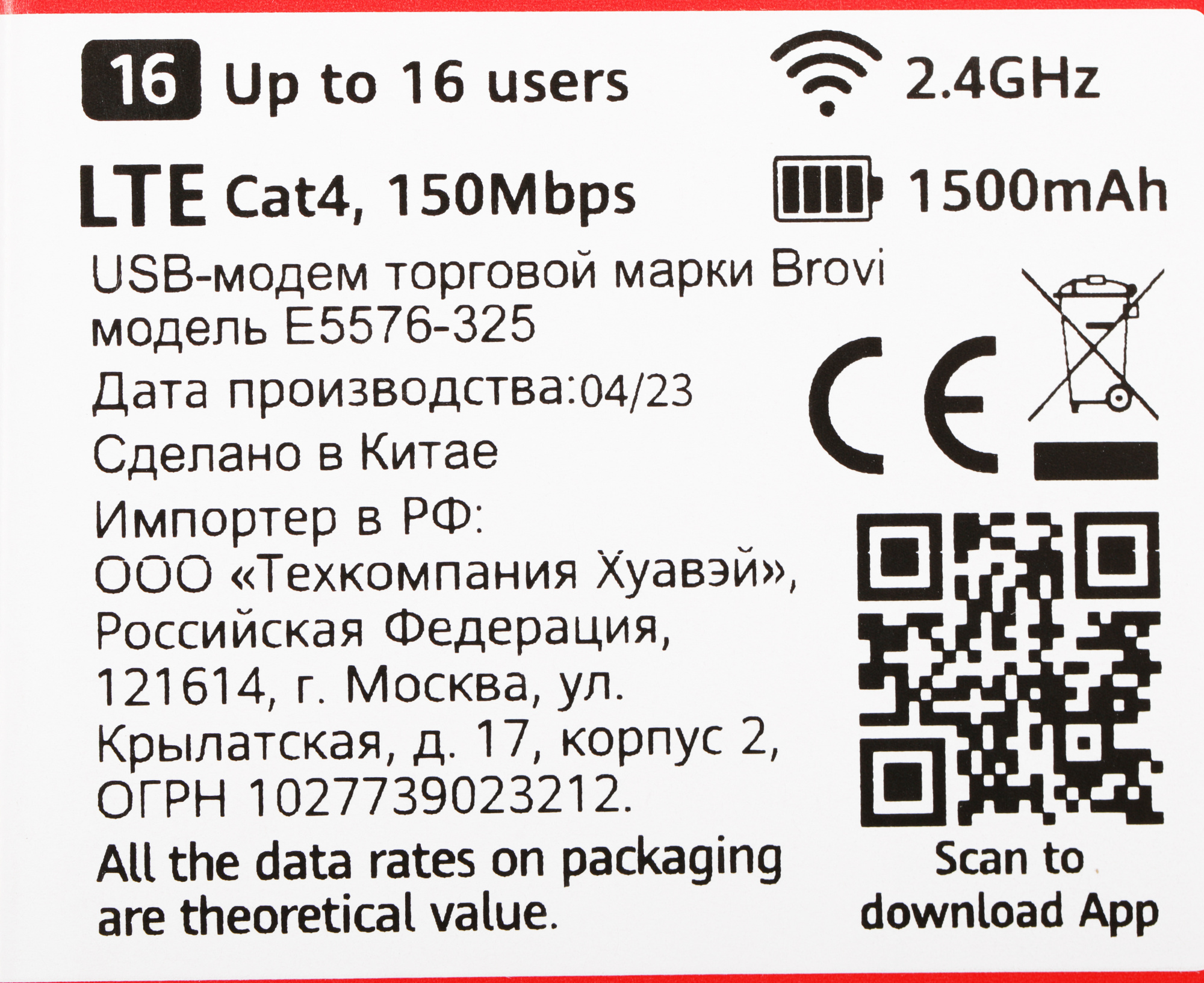Модем 3G/4G Huawei Brovi E5576-325 USB Wi-Fi Firewall +Router внешний белый