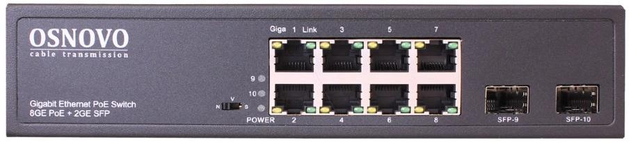 Коммутатор оснащен 8-ю портами Gigabit Ethernet (10/100/1000 Base-T) с поддержкой PoE к каждому из которых можно подключать сетевые устройства. Порты соответствуют стандартам PoE IEEE 802.3af/at и автоматически определяют подключаемые PoE-устройства.