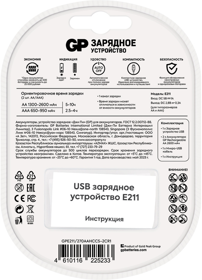 Новое зарядное устройство GP E211-270AAHCCS-2CR1 на 2 слота обеспечит аккумуляторам быструю зарядку. Устройство способно заряжать одновременно 2 батареи и рассчитано на 2 формата – АА и ААА. Время заряда: АА - 5-10 ч., ААА - 2, 5-4 ч. Входящие в комплект элементы питания предварительно заряжены.