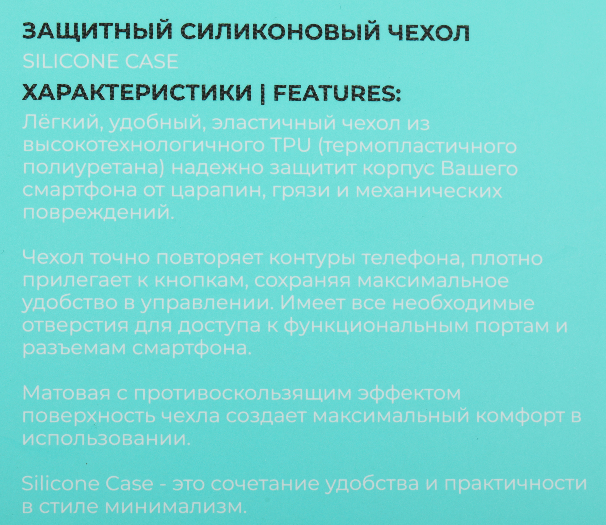 Чехол Silicone Case специально разработан с учётом всех особенностей Вашего смартфона. Благодаря толщине материала не более 0, 8мм чехол минимально увеличивает размеры смартфона, при этом защищает заднюю панель от царапин, грязи и пыли, а матовая поверхность предотвращает выскальзывание из рук.