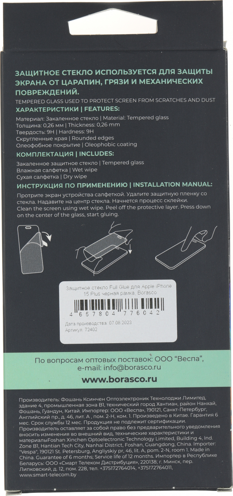 Защитное стекло для экрана BoraSCO прозрачный для Apple iPhone 15 Plus 2.5D антиблик. 1шт. (72402)