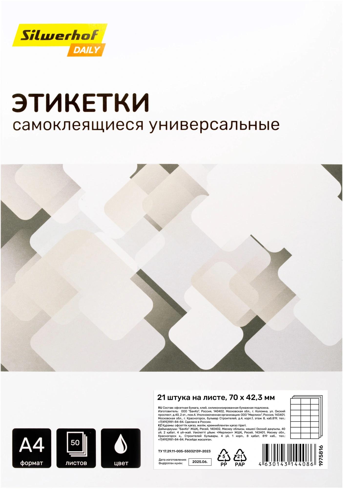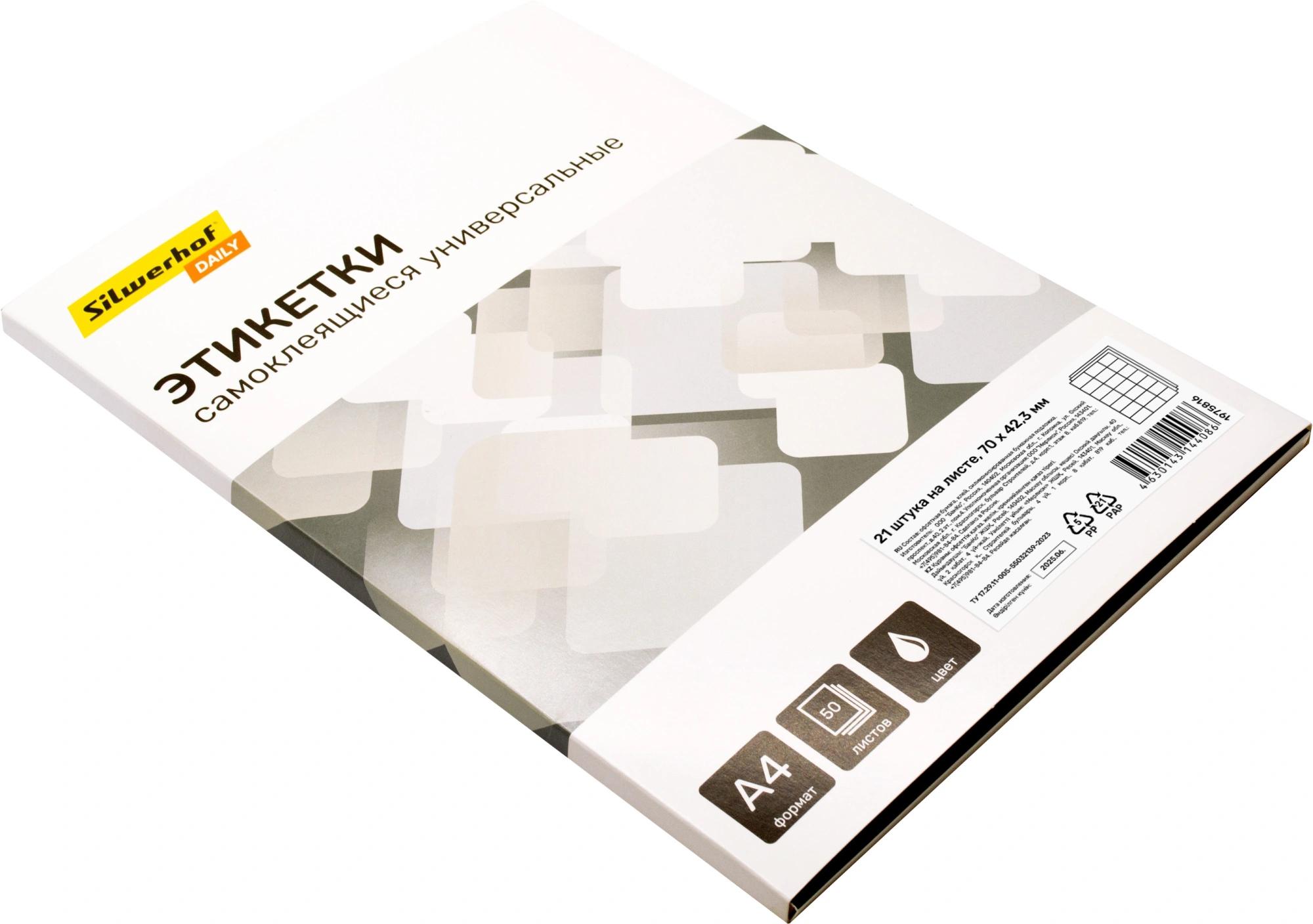 Этикетки Silwerhof A4 70x42.3мм 21шт на листе/50л./белый матовое самоклей. универсальная