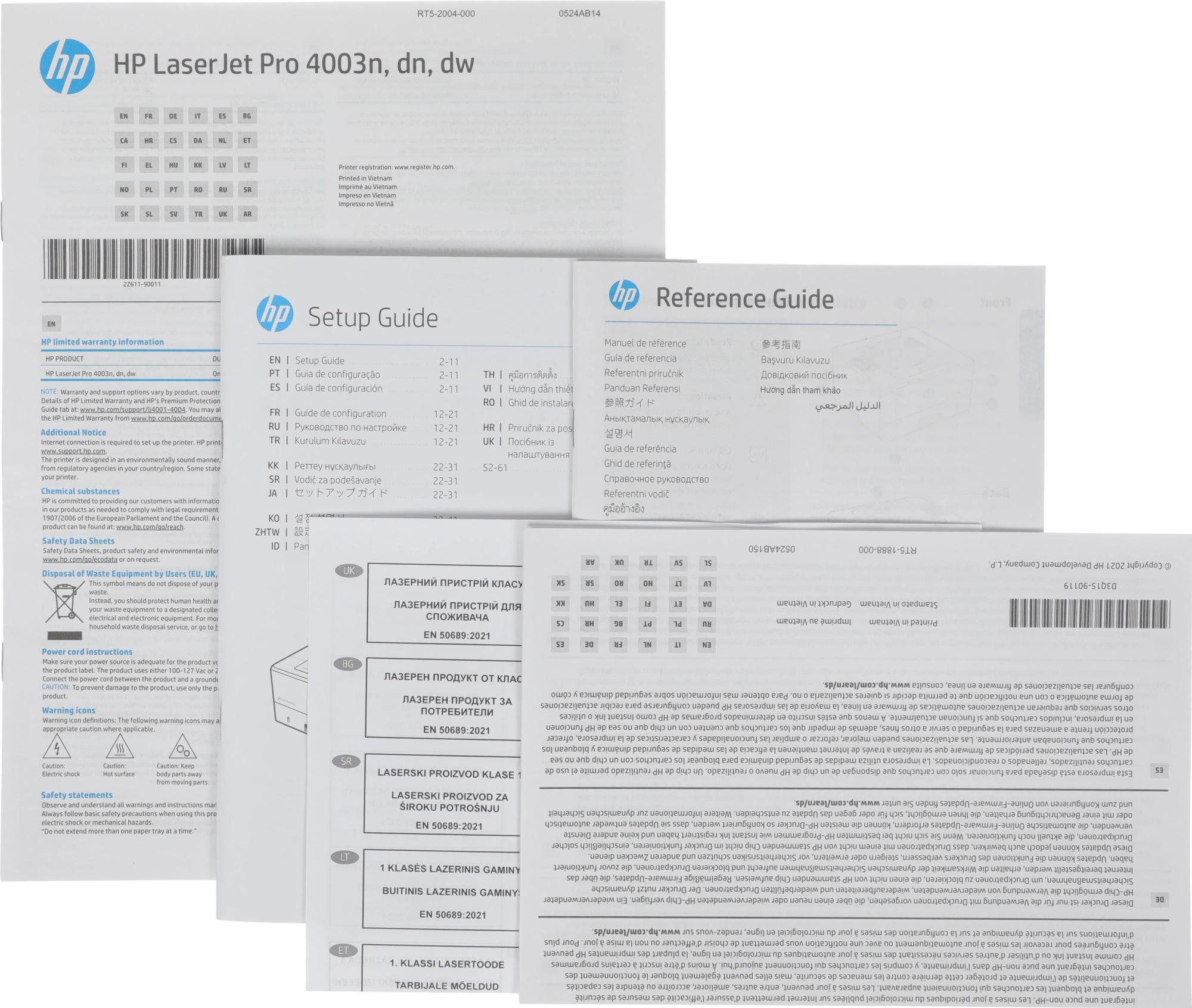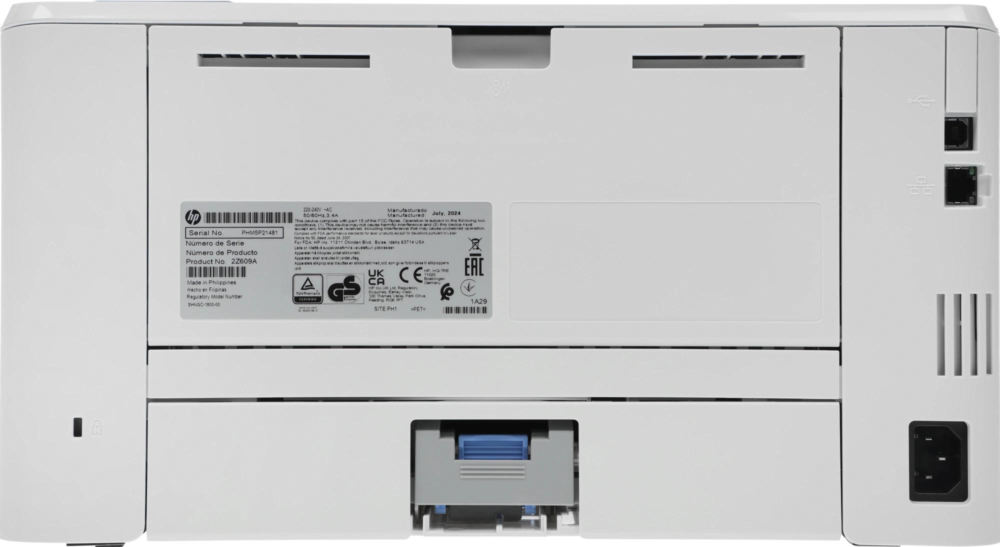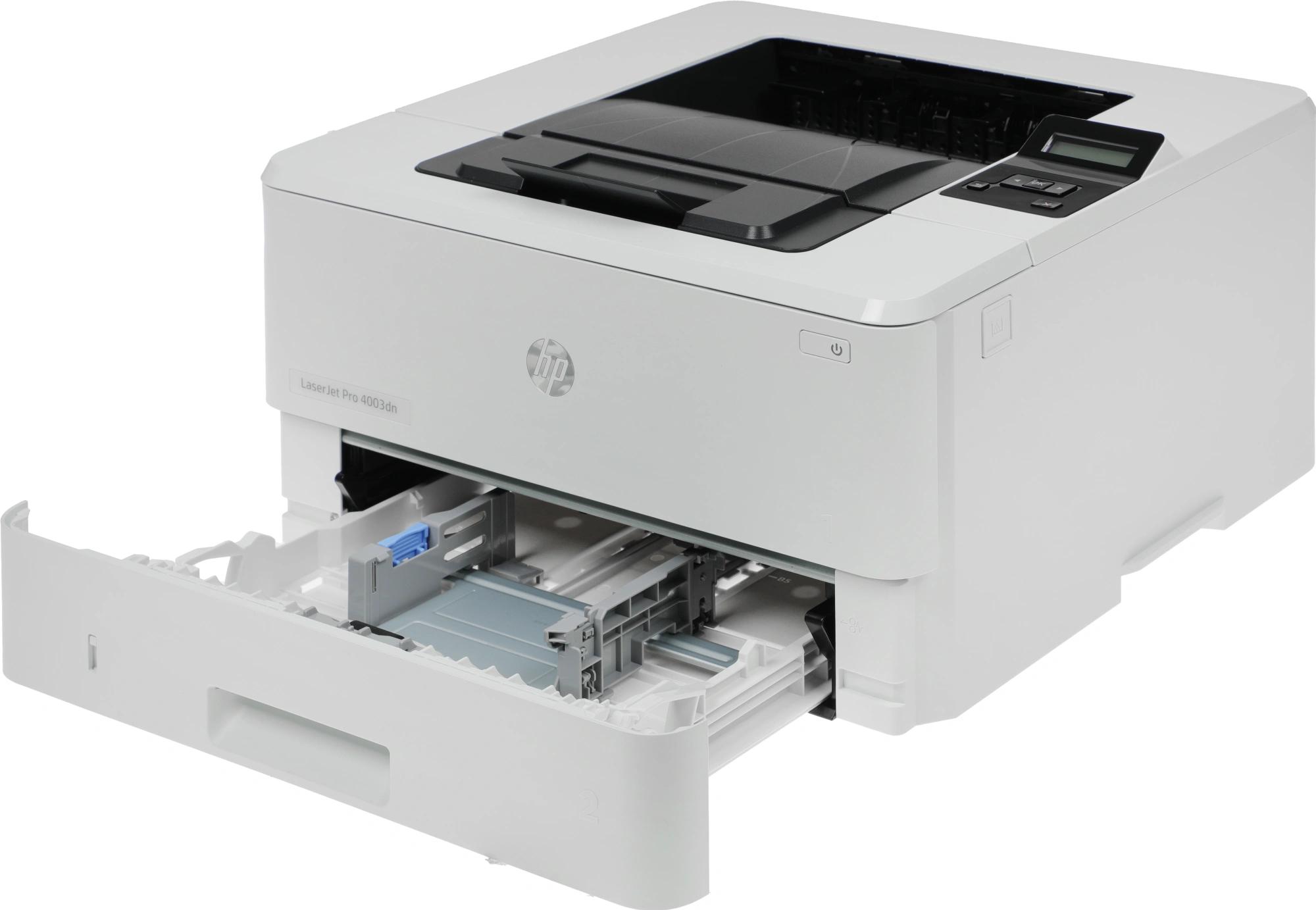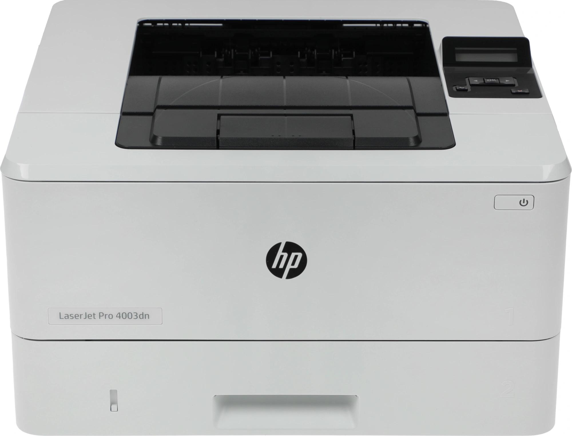 2Z609A Принтер HP LaserJet Pro 4003dn; предустановленный оригинальный лазерный картридж для HP LaserJet, черный (3050 страниц); руководство по началу работы; листовка с нормативными требованиями; кабель питания