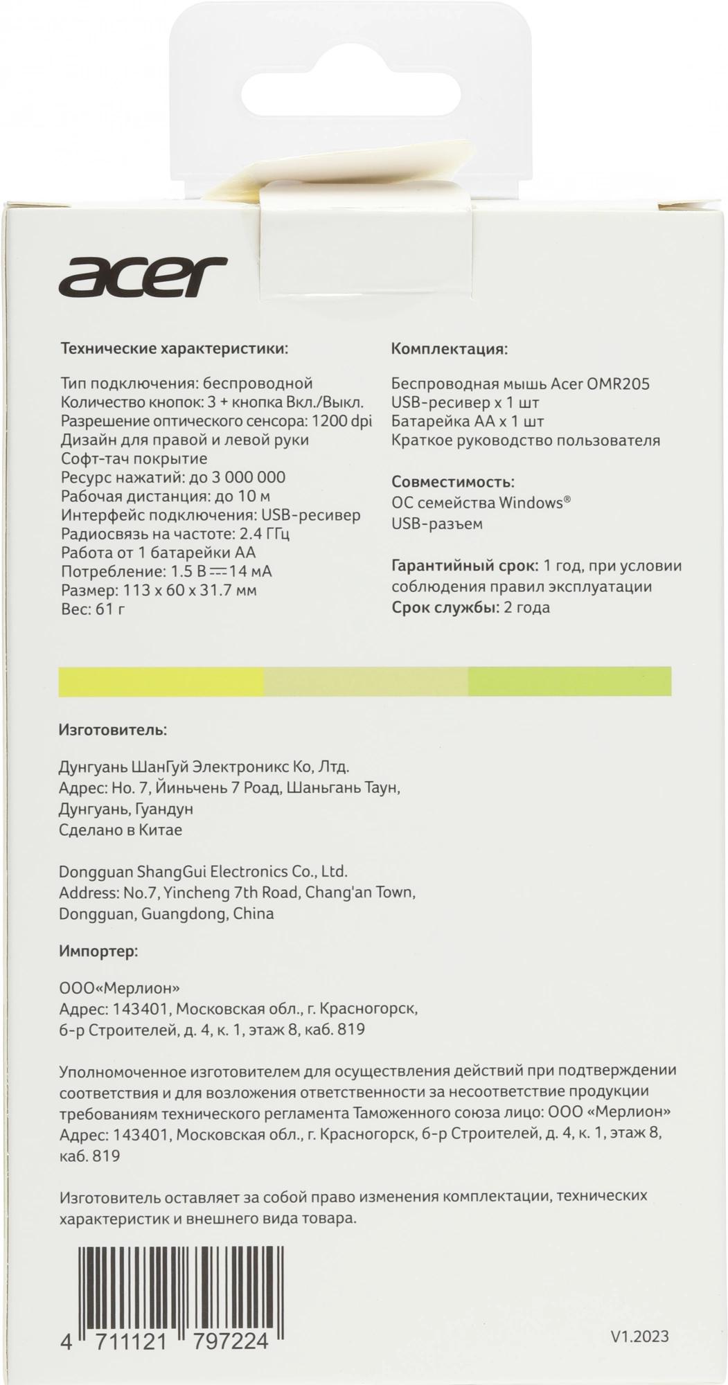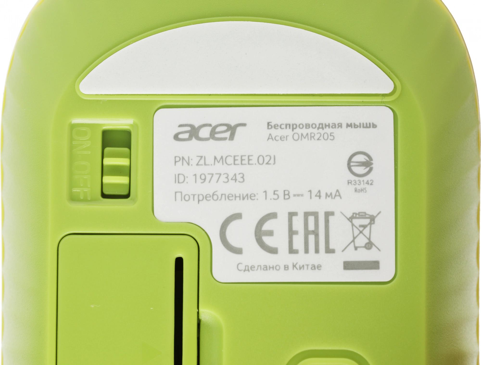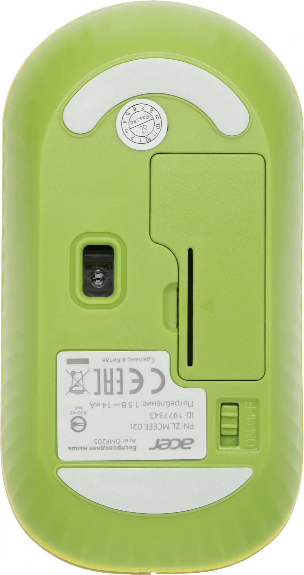 Мышь Acer OMR205 зеленый/желтый оптическая 1200dpi беспров. USB для ноутбука 2but (ZL.MCEEE.02J)