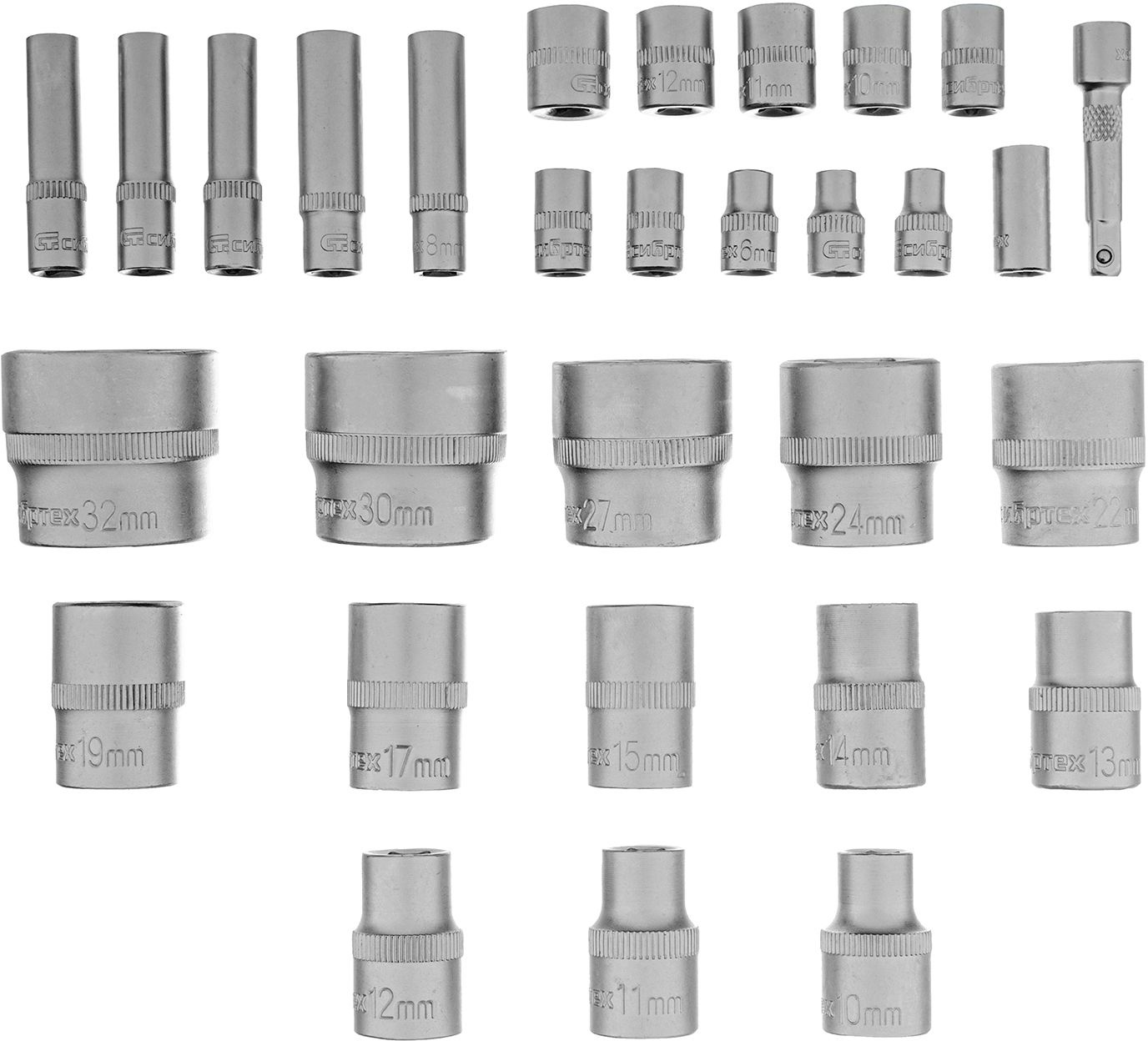 Головки торцевые 10, 11, 12, 13, 14, 15, 17, 19, 22, 24, 27, 30, 32 мм. Головка свечная 16, 21 мм Удлинитель - 125, 250 мм Многофункциональный адаптер, соединяется с удлинителем 3/8" F х 1/2" М