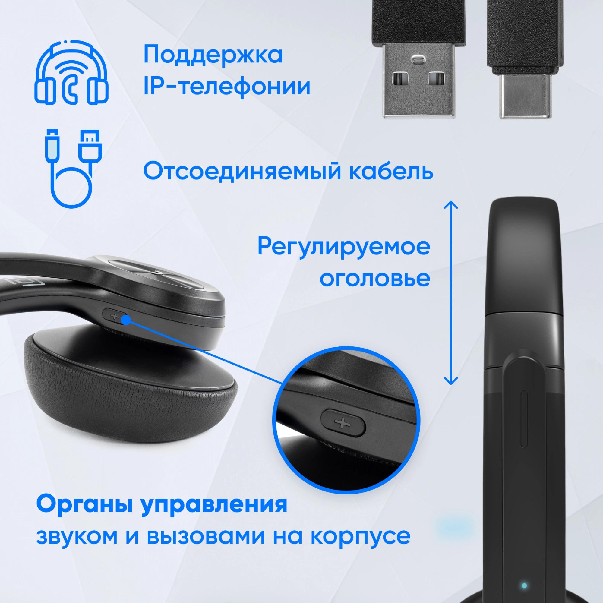 Съемный провод USB-C (на гарнитуре) - USB-A (к устройству). Провод с поддержкой передачи данных. Гарнитура поддерживает IP-телефонию Оптимизирована под работу с популярным ПО для аудио/видео приложений. Удобное, понятное управление функциями на наушнике. Угол вращения микрофона 270 градусов.