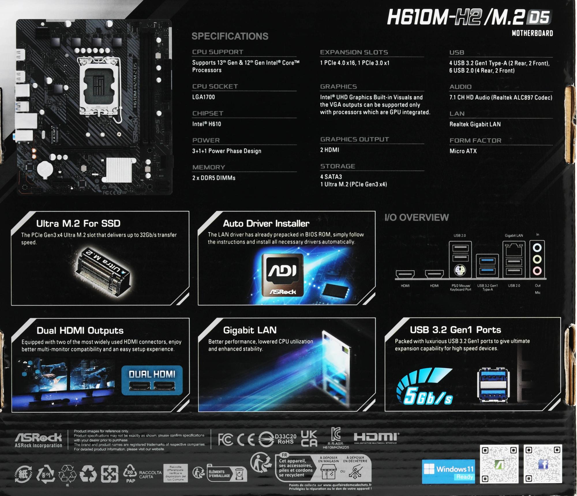 Материнская плата Asrock H610M-H2/M.2 D5 Soc-1700 Intel H610 2xDDR5 mATX AC`97 8ch(7.1) GbLAN+HDMI