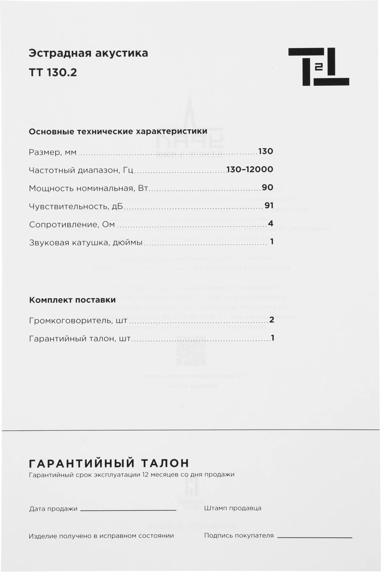 Колонки автомобильные Ural ТТ 130.2 (без решетки) 180Вт 91дБ 4Ом 13см (5дюйм) (ком.:2кол.) среднечастотные однополосные