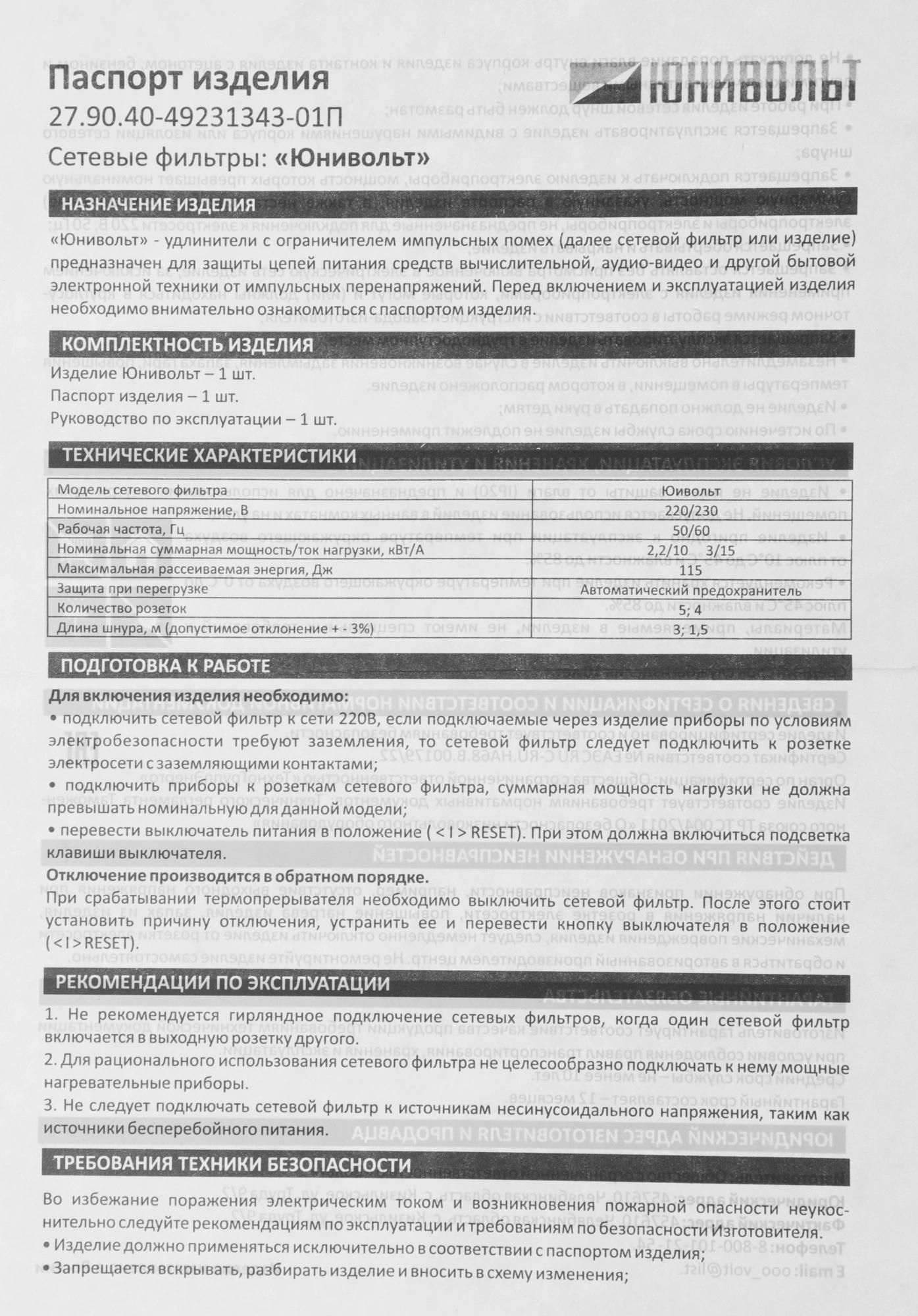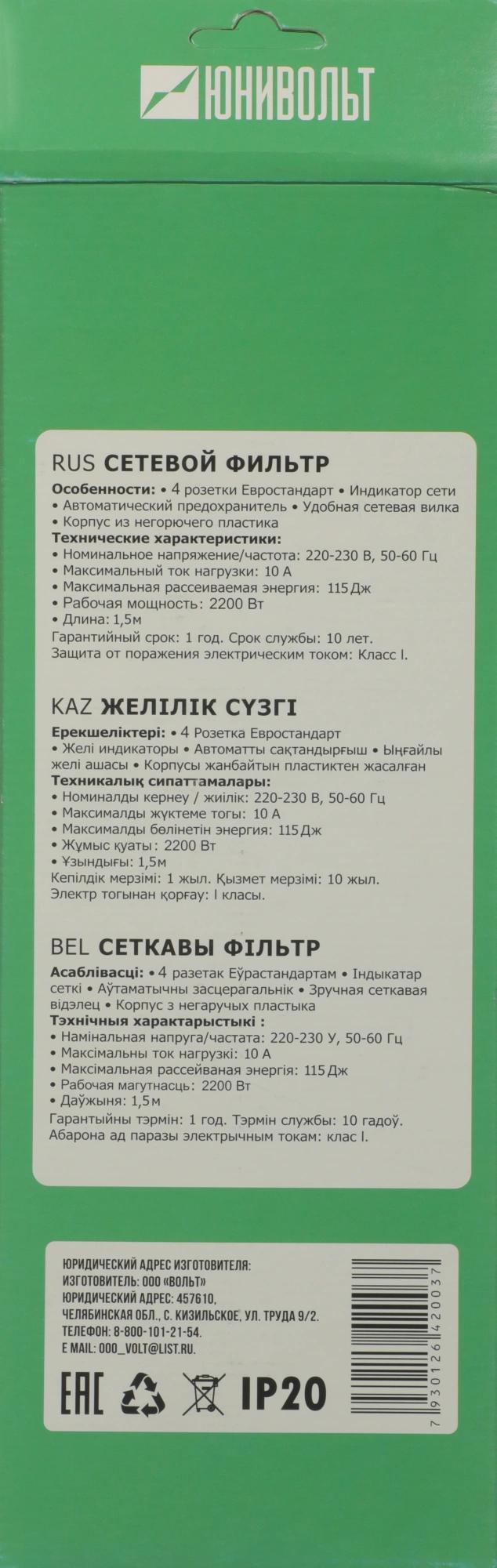 Сетевой фильтр Юнивольт 00-00000386 1.5м (4 розетки) белый (коробка)