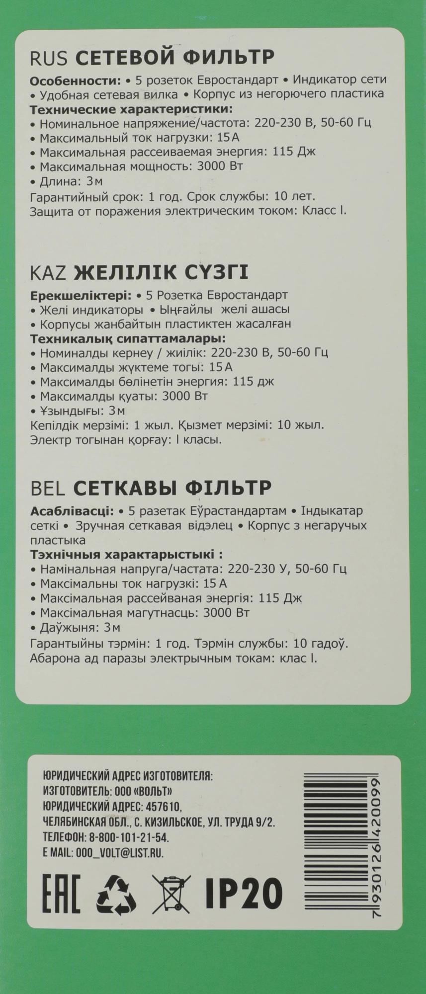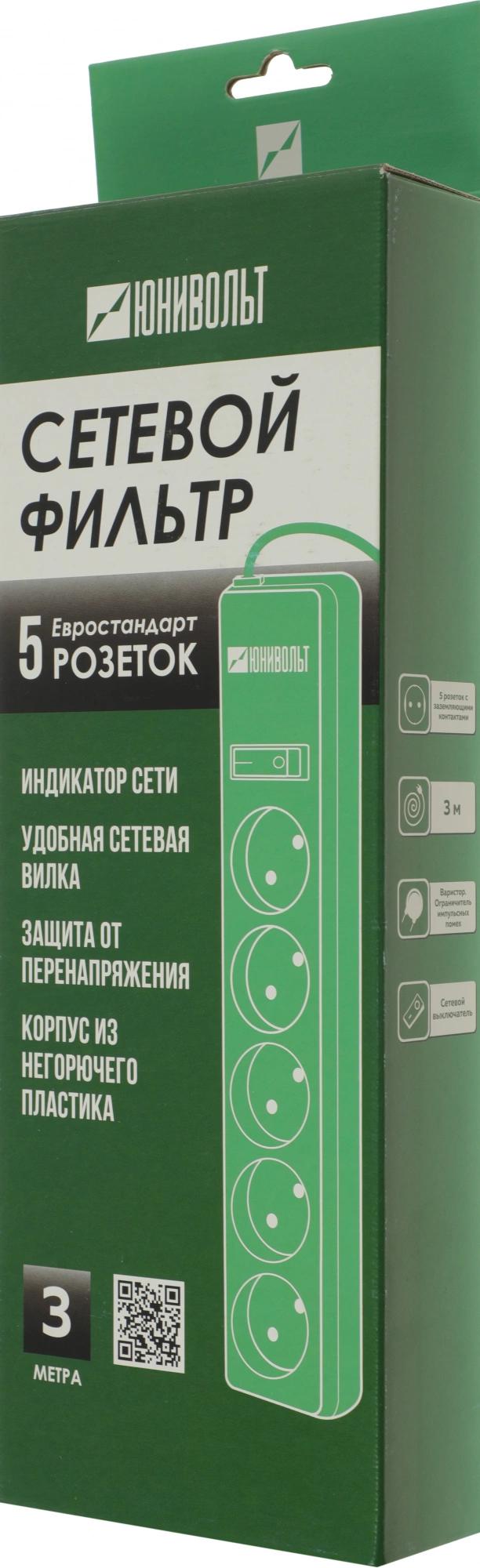 Сетевой фильтр Юнивольт 00-00000406 3м (5 розеток) белый (коробка)