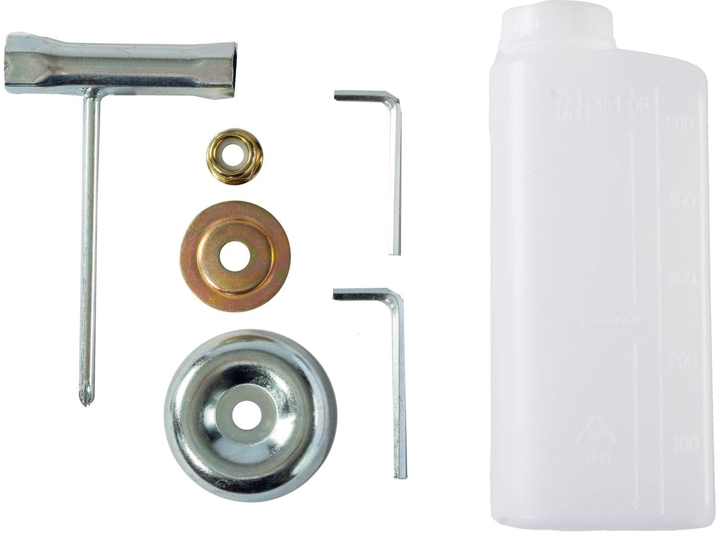 Триммер бензиновый, Защитный щиток, Наплечный ремень, Шпулька с леской, Пильный диск 40 зубьев, Ёмкость для приготовления топливной смеси, Шестигранный ключ - 2шт., Пластиковые стяжки - 2шт., Свечной ключ, Инструкция