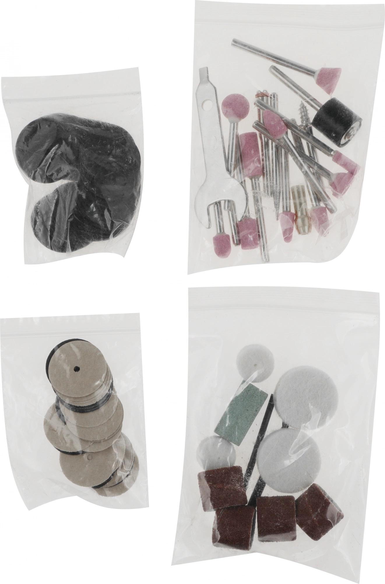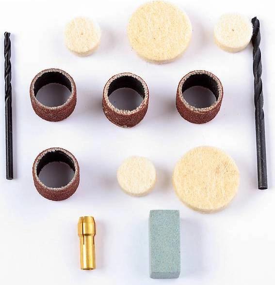 Отрезн. круги - 36 шт.; шлиф. бумага - 36 шт.; абразив. шлиф. головки - 10 шт.; держатель шлиф. лент с хвостовиком 3.2 мм.; шлиф. лента - 4 шт.; сверла - 2 шт.: 2.3/3.2 мм.; гравиров. резец - 2 шт..; держатели отрез. и полир кругов - 2 шт..; войлоч. полир. круг - 4 шт..